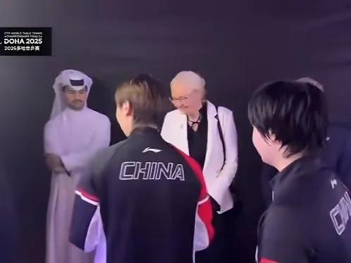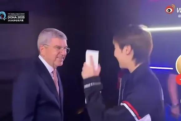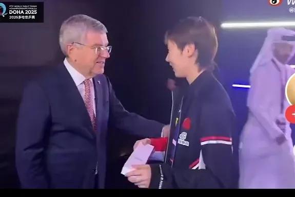 多哈,曼昱受到奥委会主席巴赫独宠,这也太羡慕人了吧! 国际乒协主席索林和巴赫会见各国选手,轮到曼昱时,只见巴赫双手递给曼昱一个白色长方形盒子,貌似说:‘’送你的礼物。‘’ 曼昱接过礼物,不相信似的把礼物举起来,笑着对巴赫貌似问:‘’真的送我的?‘’ 巴赫像个慈祥的长辈,很自然的用左手拍拍曼昱的右胳膊,貌似说:‘’孩子,你一路走来辛苦了,25年取得好战绩,值得国际乒协奖励。2026年再接再厉!‘’ 曼昱受宠若惊,太开心了,她和乒协主席握手之后,手里拿着礼物原地转,竟然不知道朝哪儿走。