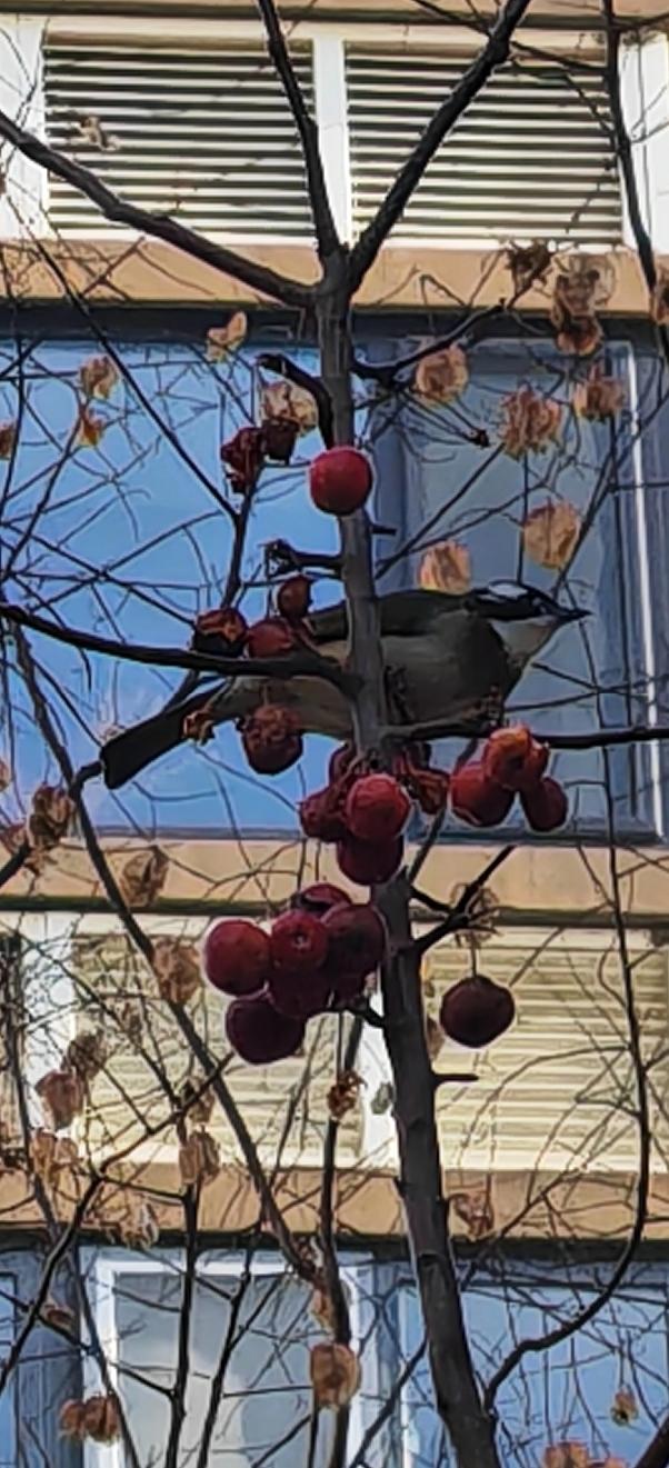 窗外的树树枝上,还有类似酸楂的红果,不只是美观,更成了冬天白头翁冬天的口粮,看来小区绿化设计时,美观设置了,还为鸟儿们考虑冬天的食粮。小区的居民更是爱护果树,也就有鸟儿们的光顾。人与自然和谐相处。