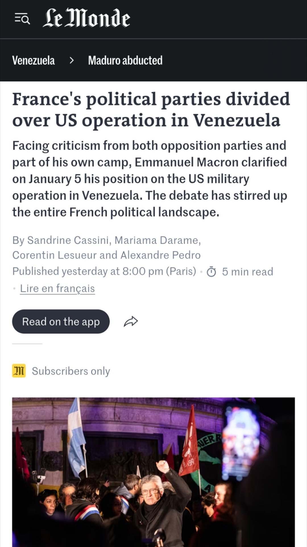 马克龙的表态变了¹ 马克龙第一反应是叫好。但法国反对党、他自己的党内都发生争议,不得不改口。但只敢说:“我们捍卫国际法。既不支持也不赞成。”法国外交部发言人:美国“采取的行动手段没有遵守国际法,对此我们深感遗憾。”法国外交部长:谴责美国的行动,破坏了国际法。² 一直认为微博上许多支持“国际法”“反对侵略”、声嘶力竭甚至抹眼泪的人们,都有一种表演心理和变态扭曲心理作祟。他们本质上是慕强的、崇美的。为了实现他们心目中的“正义事业”,什么侵略、帝国主义、杀人放火,都是可以的。热点科普