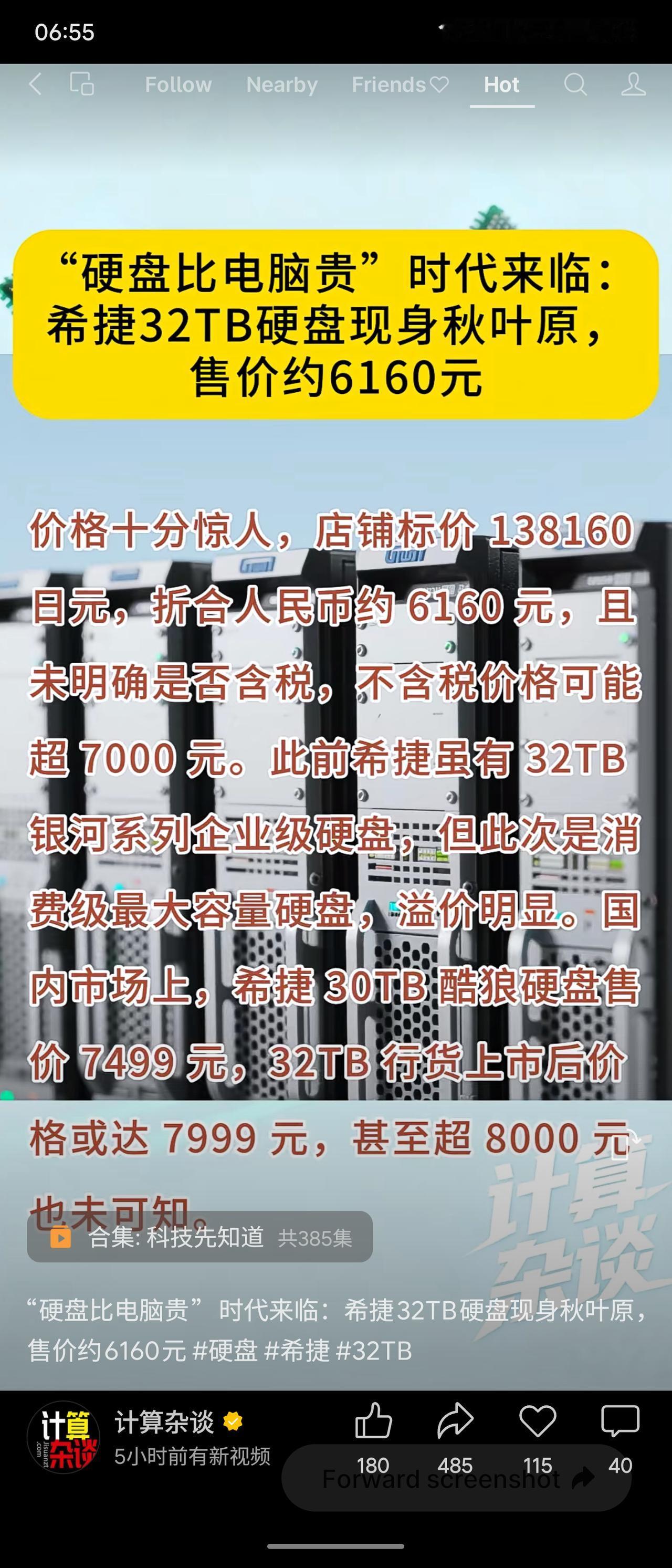 日本秋叶原市场近期出现希捷酷狼系列32TB机械硬盘,售价约6160元人民币,面向高端NAS用户。此款为当前消费级最大容量硬盘,其售价已超过许多普通电脑整机价格,引发关注。