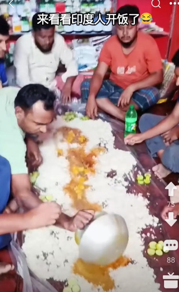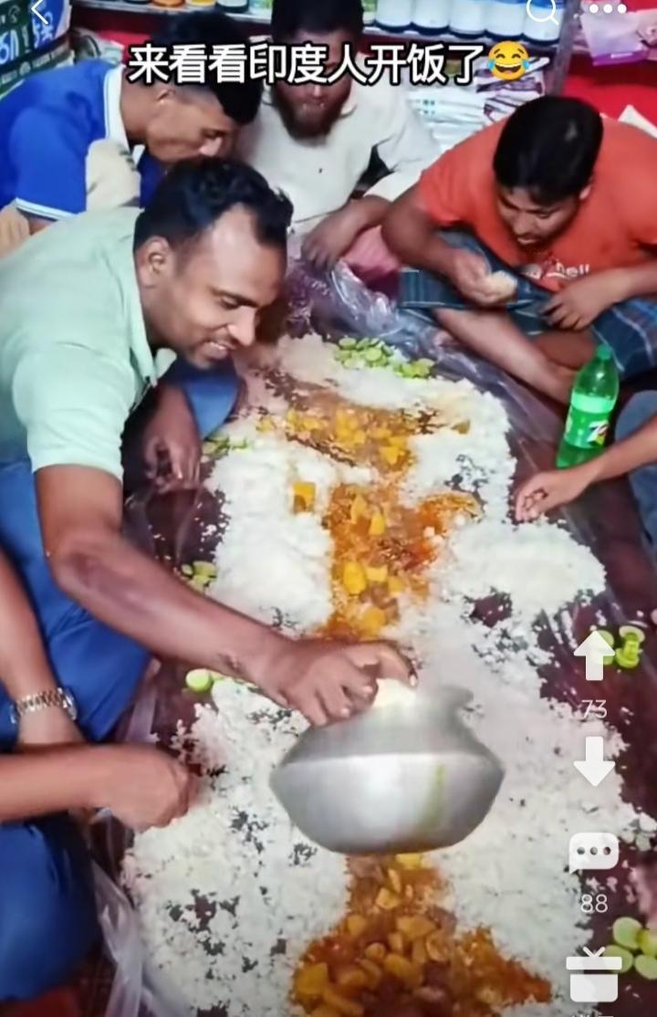 印度人开饭了。 一群人席地而坐,把大米饭铺在胶布上,再淋上黄中带黑的咖喱酱,然后用手抓起饭,沾着咖喱酱,送进嘴里。 他们吃很是津津有味,我们看得是恶心呕吐。 如果他们当中一人有病,这一群人会不会一锅端了?