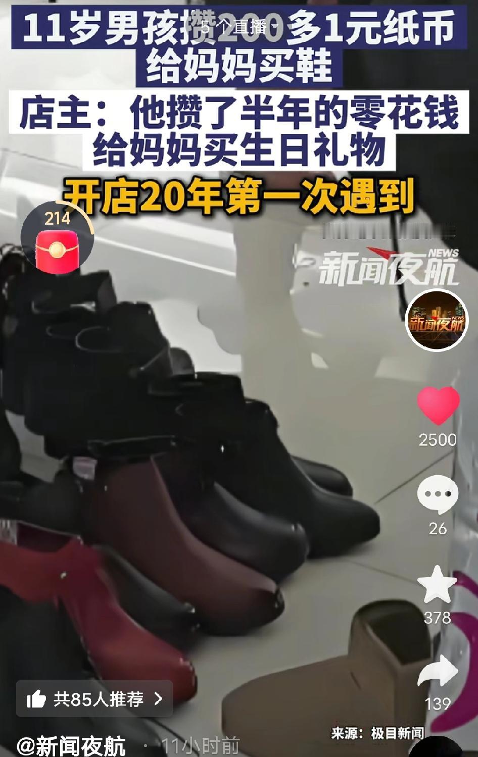 暖哭了!一个11岁的小男孩,抱着鼓囊囊的存钱罐冲进鞋店,哗啦啦倒出200多张皱巴巴的1块钱纸币——有的攥得发皱,有的还带着汗渍,全是他攒了半年的零花钱,就为给妈妈挑一双舒服的生日鞋。 元旦那天,石家庄的风嗖嗖地刮,跟小刀子似的,小男孩鼻尖冻得通红,小手也揣在袖子里,却顾不上搓一搓。他踮着脚尖扒着鞋架,小脑袋凑得老近,一双一双地摸:先按按鞋底软不软,再掰掰鞋帮磨不磨脚,嘴里还小声念叨着:“我妈妈下个月过生日,天天上班站一整天,脚疼得厉害,我要给她挑双最好的。” 挑了好半天,终于小男孩眼睛一亮,指着一双米白色的小白鞋,笑得露出两颗小虎牙:“这个好看!妈妈穿了肯定显年轻!” 店主颜姐本来以为孩子是来买玩具或者零食的,看到这一幕,眼眶一下子就热了。她开店20年,见过豪掷千金买名牌鞋的顾客,见过情侣互相送鞋秀恩爱的,却头一回见孩子捧着一沓零钱,把对妈妈的惦记攒得这么满。颜姐没多说啥,悄悄给了个最低价,还从柜台底下翻出两双毛茸茸的厚袜子塞给他:“天冷,让你妈妈配着鞋穿,暖和!” - 有网友说:“这哪是钱啊,这是娃一点点攒起来的爱,比金镯子都贵重!” - 也有网友说:“我家娃11岁还跟我哭着要奥特曼卡片呢,这孩子也太懂事了!” - 还有网友说:“店主也好好啊,善良的人总能碰到暖心的事!” 我刷到这个事儿的时候,真的忍不住嘴角上扬。 你想想啊,一个11岁的小孩,正是嘴馋爱玩儿的年纪,得忍住多少次买辣条、买干脆面、买奥特曼卡片的冲动,才能把这200多块钱一张一张攒下来?这可不是简单的零花钱,是他揣在兜里、记在心里的惦记啊! 现在好多人总说爱要怎么表达,其实哪需要什么花里胡哨的东西。一双合脚的鞋,一沓皱巴巴的钱,一份藏了半年的心意,就足够暖透一个妈妈的整个人生了。 这个小男孩用最笨的办法,告诉了我们最真的道理:爱不是用钱堆出来的,是用心攒出来的。 暖心瞬间 孝心少年 人间小温暖 来源:新闻夜航,极目新闻