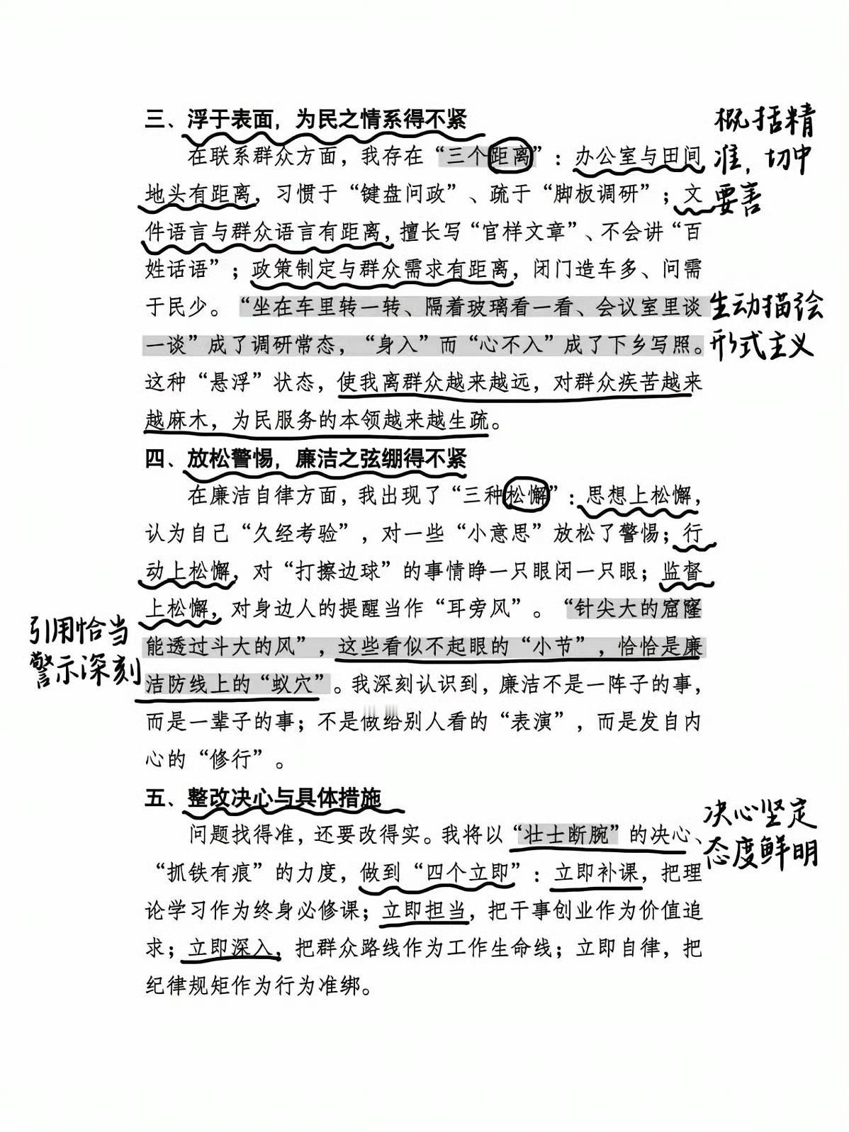 这篇自我批评堪称范本!用手术刀般的精准剖析问题,以显微镜似的细致查摆不足,从学用脱节到担当不足,从脱离群众到廉洁松懈,每一点都戳中要害、直指本质,整改措施更是掷地有声。这般动真格、见筋骨的自我反思,远比流于表面的“走过场”更有力量,值得细细品读与学习。