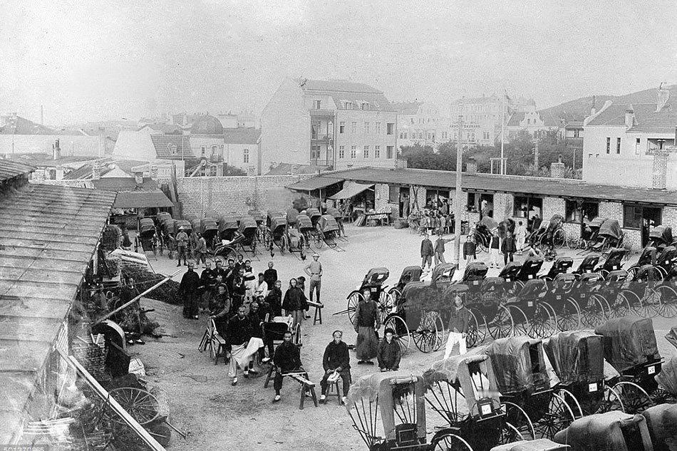 这是一张拍摄于清末至民国初年的青岛黄包车站,照片从高处俯瞰一个宽阔的空地,四周停满了数十辆人力车,车篷大多盖着防雨布,车夫们三五成群,或坐或站,有的在休息聊天,有的在等客。 黄包车在青岛的兴起稍晚于上海、北京,但到1920-1930年代已成为主要短途交通工具。青岛黄包车业发达,高峰期车数达数千辆,车夫多为来自山东农村的贫苦农民,生活条件艰苦。照片中这个“车站”实际是车夫集中等客的空地。