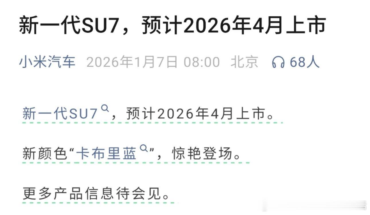 新一代小米SU7亮相,这消息太让人兴奋了!1月7日小米官宣,预计2026年4月上