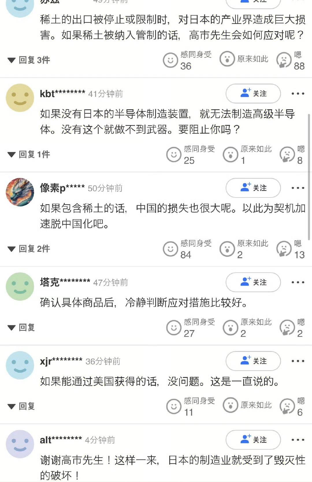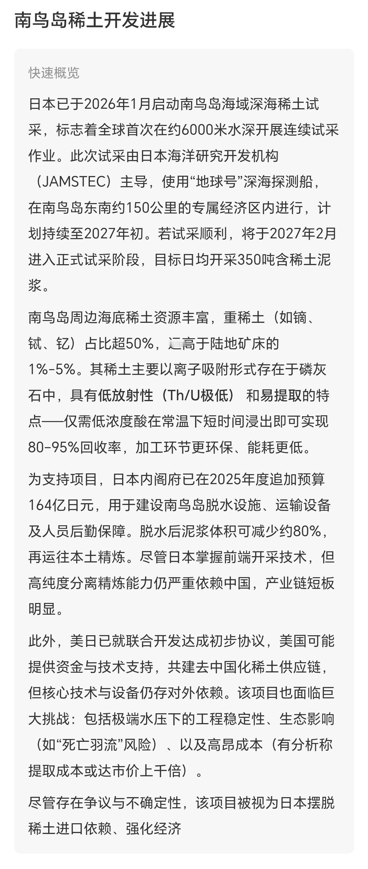 日本雅虎评论区,对于中国禁止出口两用物资给日本,看来他们还觉得没什么。只有个别人觉得这是毁灭性的。他们把稀土寄希望于南鸟岛的深海稀土试开采。 他们计划于1月11日在南鸟岛东南约150公里海域进行试开采,试采一年。可是这地方远离日本,根据《波茨坦公告》,日本领土只有四个本岛,上千海里外的小笠原群岛咋就成你的了。就算你开采出来了,精炼技术只有中国的1/100,你咋个整?! 小本子在评论区还说要反制?小本子有什么能反制的呢?y片吗?高端光刻胶?高端光刻机都被制裁好几年了,咱们也不太需要吧。何况韩国有,我们自己也有。当初老美就禁止盟友出口,前两个月就没有出口了,所以不用急,我们有替代的,我们的战略是全方位的。他停了也好,咱们就停他的光刻胶原料。