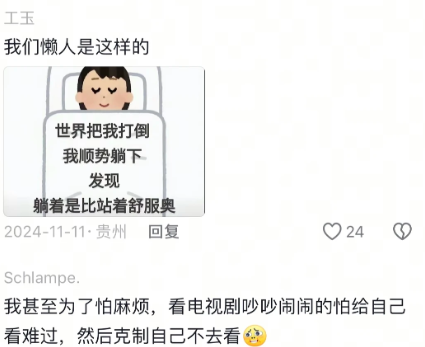 我甚至为了怕麻烦,看电视剧吵吵闹闹的怕给自己看难过,然后克制自己不去看