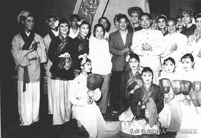 周恩来、邓颖超在津观看天津人民艺术剧院歌舞团演出后,与《石义砍柴》剧组演员合影。