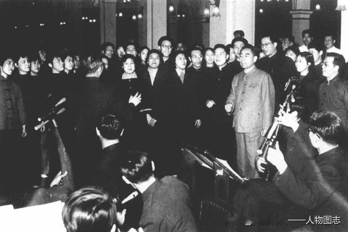 1966年1月23日(春节),周恩来在天津干部俱乐部与天津文艺工作者联欢。