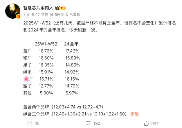蓝厂这算是提前锁定年度第一了吧?16.76%的市场占比,差点就被小米追上了,这里得感谢一下REDMI K90系列,哈哈!其实这个成绩我没啥意外的母品牌vivo主攻影像,包括vivo X200系列、X300系列、S30系列、S50系列就不用多说了吧?Y系列国民机型不用多说了吧?子品牌iQOO专打性能和游戏,iQOO15、Neo11系列这些卖的也贼好,而且iQOO应该是2025年所有子品牌里面综合表现最好的了吧?除了品牌矩阵和产品矩阵,技术矩阵蓝厂做的也挺好,蓝心大模型、蓝海电池系统、还有自研影像芯片和游戏芯片,这些都是真金白银砸出来的。更重要的是,蓝厂很少卷入舆论纷争,而是专注于产品研发、渠道管理和用户服务,稳定地打磨产品、深耕线下数十万家门店构成的渠道网络,这种低调务实的企业风格才是蓝厂赢得关键~vivo