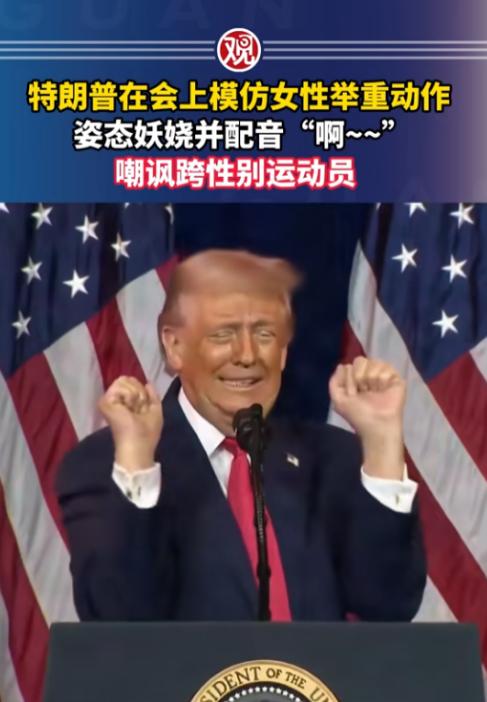 特朗普最近演讲又整出大动静了,站在台子上攥着俩拳头,故意抻着腰扭得那叫一个“娇俏”,还拖着长音嗲嗲喊了声“啊”。 别当他是犯迷糊,这是明着模仿女性举重的样子,专门冲“跨性别运动员打女子比赛”来的。 而台上这一出又扭又喊,直接把台下搅成了两半,一半支持者跟着起哄吹口哨,另一半人皱着眉觉得这事儿太别扭。 这可不是他头一回拿跨性别运动员“开刀”,之前奥运会那跨性别举重选手哈伯德、美国大学的跨性别游泳选手托马斯,都被他拉出来当过“活例子”。 甚至还开过大离谱的玩笑,说篮球巨星詹姆斯要是“变个性去打女篮”,那冠军得被他直接包圆了,话里话外都写着“不乐意跨性别者掺和女子体育”。 到2025年2月,他干脆来硬的,签了份行政令明明白白禁止跨性别运动员参加女子体育赛事。 然而这次演讲里的“模仿秀”,就是把这份强硬立场套了层“搞笑外壳”。他在台上演得越夸张,台下支持者喊得越响。 但不少人越看越膈应,这扭捏的姿态既糟践了普通女性的形象,也没半分尊重跨性别群体的身份,说穿了就是拿争议话题当“流量密码”蹭热度。 说到底,特朗普这声“啊~”根本不是闹着玩,他就是把自己反对跨性别运动员打女子赛事的想法,用最惹眼的方式摆上台面,既接着他那“啥都敢说敢演”的劲儿,也让这本来就吵成一锅粥的事,又添了层带刺的热闹。 至于这操作是真为“体育公平”,还是单纯赚眼球?估计看的人心里都门儿清。