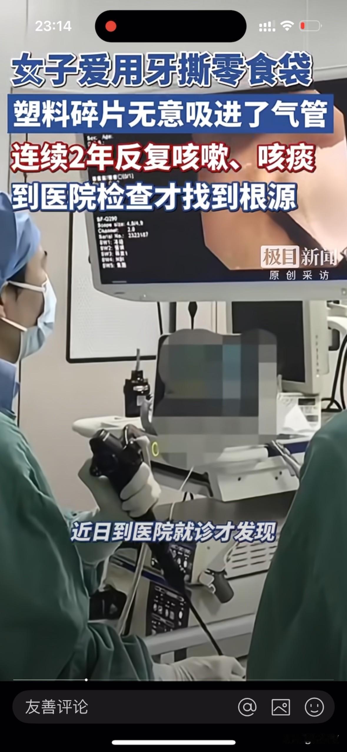 “意想不到有危险⚠️”湖北武汉,一名女子近两年来反复咳嗽、咳痰,不是感冒发烧,嗓子也不痛不痒。近日去医院做检查时发现右下肺支气管深处竟有2块小塑料片。正是这两块塑料片导致她两年反复咳嗽。 现在好多的食品都是即食零食,打开塑料外包装就可以品尝到美味了。打开方式各种各样,有手撕的,有用工具的,更有甚者用牙齿去咬。但方便的同时,也带来了意想不到的危险! 据媒体报道,湖北武汉的李女士从两年前就有点咳嗽,她也没放在心上,以为自己着凉了,引发了炎症,到药店买了点消炎药来吃,吃了几天也就好了。后来多次出现这种情况,李女士便习以为常。 今年冬天,李女士的咳嗽加重了,但除了咳嗽还是没有别的。李女士还是认为自己体寒造成的,便去看了中医,开些中药来调理。 刚开始喝中药时确实有效果,但疗程一结束便复发。 近日,她的咳嗽越来越重,咳出的痰里偶尔还带些血丝。家人劝她赶紧去大医院做检查,劝她有病不能拖,趁着治疗。 李女士到医院一检查,医生发现她右肺下支气管里竟然有两片异物,正是这异物卡在气管里导致她咳嗽。医生通过气管镜手术把异物取出来一看,原来是两块塑料片,塑料片在气管里已经被磨平了棱角! 原来李女士平常在家喜欢吃些袋装的零食,撕不开袋子的时候就用牙齿去咬,有时候碎成小块的塑料袋就随着呼吸进到了气管里。经过治疗,李女士已经康复。 网友:我以前也经常这么干,撕不动就咬开,看了这个视频,以后再也不敢了。 取材网络,侵删