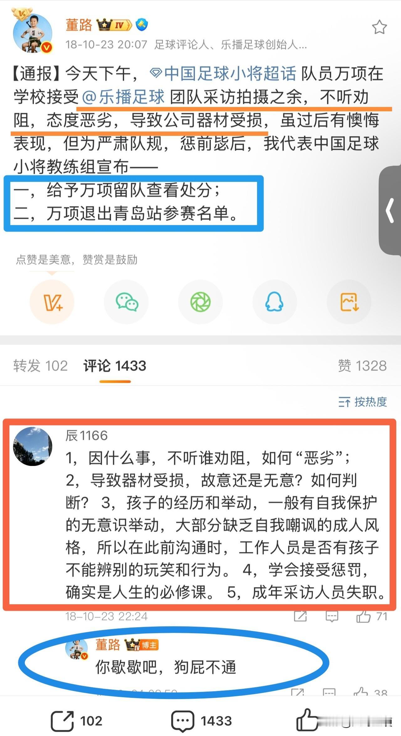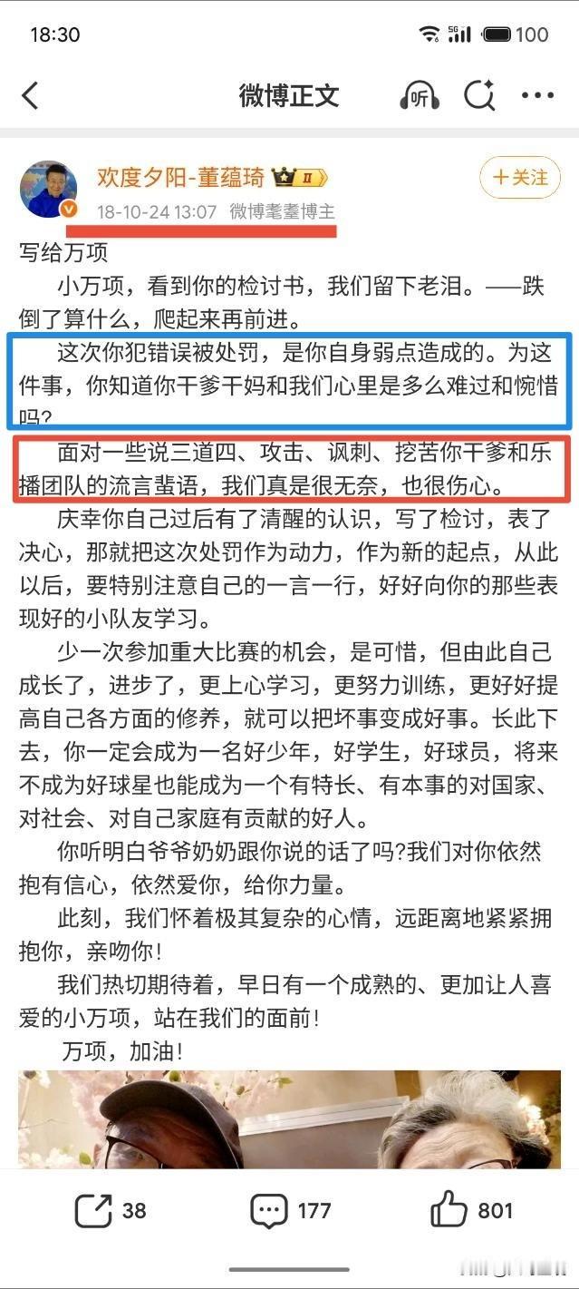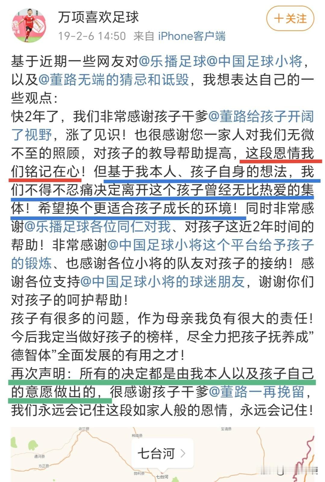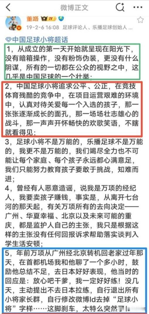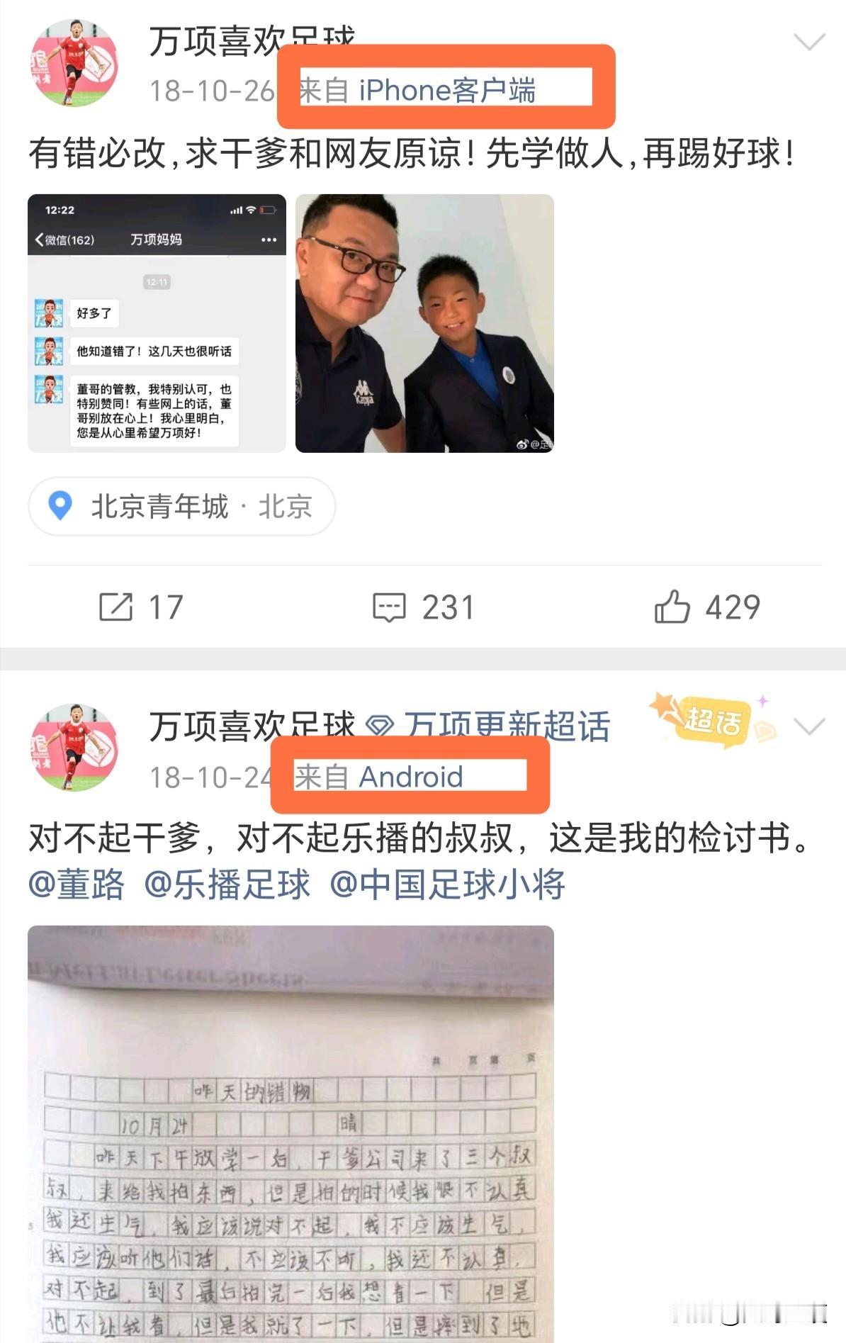 万项为何无缘清华附中!讲讲09国少队核心万项,当初万项母子被网暴的那一段历史吧[流泪] 鉴于清华附中罗主任,在昨天的微博中主要谈及的,就是万项为何无缘清华附中的来龙去脉[思考] 那么今天,小编就静下心来,按照当时间轴,讲讲万项无缘清华附中的始末,回顾万项母子在那一段,可以说是不堪回首的往事中,到底经历了什么…… 【图一】:清华附中与中国足球小将正式签署战略合作协议的报道🎙 【图二】:2018年10月23日20:07,董路在其个人社交媒体上发文,通报事情经过,以及对于万项的处罚。有网友在评论区提出质疑,竟然被董路回怼,评论区里充斥着对万项及其母亲的教育[恐惧] 这里面有一个不容忽视的细节,事件发生的背景是万项在学校上学期间,接受乐播团队采访拍摄时。那么问题来了,为何要选择万项在校上学期间去采访拍摄呢?考虑过会耽误孩子上课吗?[what] 【图三——图七】:在董路这篇【通报】的评论区里,董路母亲和二婚妻子悉数登场[吃瓜群众] 【图八】:2018年10月24日10:55,万项在其社交媒体上晒出《检讨书》[思考] 【图九】:这里面有一个极易被忽视的细节,万项母亲在评论区里回复网友的一句话:原来的微博是乐播工作人员打理。从【图十】当中两条微博发送来源的机型不同,基本上可以佐证万项母亲讲话的真实性[思考] 因此,万项的检讨书是其本人自愿发出的?或是万项母亲自愿发出的?亦或是乐播工作人员发出的?这个问题交给大家自己去思考去揣摩[灵光一闪] 【图十一】:2018年10月24日13:07,也就是事发第二天,万项《检讨书》被发出后两个多小时,董路的父亲登场了,在其个人社交媒体上,发了一篇洋洋洒洒的长文,又将万项“教育”了一顿…… 【图十二】:2018年12月28日,在清华附中与中国足球小将的战略合作签约仪式上,万项站在合影第一排最右边,但可以看到,唯独万项没有穿中国足球小将的统一着装(具体原因不详)[晕] 【图十三】:2019年2月6日14:50,万项母亲在社交媒体上发文,怀着复杂的心情,在做出各种感谢之后毅然宣布离开[流泪] 【图十四、图十五】:2019年2月6日16:05,也就是万项母亲发文不到两小时,董路在其个人社交媒体上发文列出十条,其中就有那句经典的“有足够的机会后悔”[灵光一闪] 至此!万项离开中国足球小将,彻底无缘清华附中[泣不成声] 不知道有没有人想过,万项当时只有9岁,又是单亲家庭,母子二人来到北京,可以说是孤苦伶仃、无依无靠。换位思考!就当时发生的这件事儿,是不是可以私下在球队开会时解决,真的有必要把这事儿挂到网上,让万项母子接受来自各方的“教育”吗?[what] 更让人费解的是!董路当时几乎可以说是是全家上阵,其父母、二婚妻子都纷纷在评论区站出来,真的有必要这么做吗?这事儿做的是不是有点儿过了?[what]
