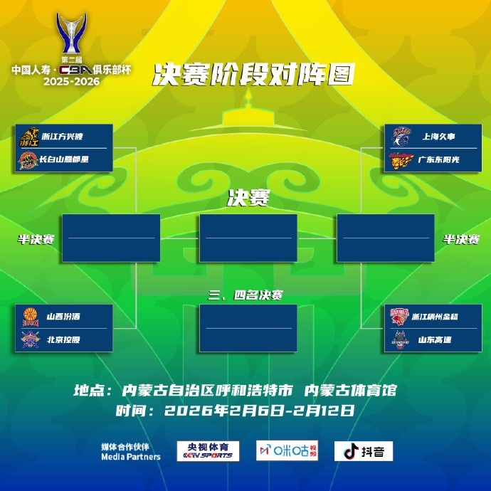 “第二届中国人寿·CBA俱乐部杯决赛阶段揭幕战定于2月6日16:00打响,2月12日19:30进行总决赛,期间八强球队浙江稠州金租、山东高速、上海久事、广东东阳光、浙江方兴渡、长白山恩都里、山西汾酒、北京控股将在内蒙古自治区呼和浩特市按照对阵进行单败淘汰赛(共8场比赛),按排名办法最终产生本届杯赛所有名次。”CBA官博如是写道。