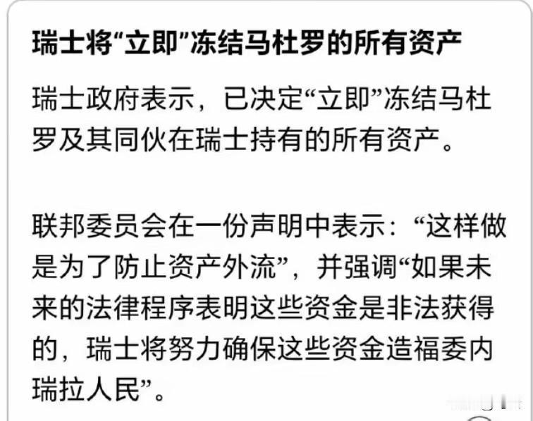 瑞士的中立神话因俄乌冲突早已千疮百孔,也不在乎再多添加这一例。瑞士联邦委员会下令,立即冻结与马杜罗及其亲信有关的资产,以确定这些资金是否为非法获取。我就在想,特朗普都能栽赃他国总统贩毒和非法持有机枪,瑞士想给他人资金安排一个罪名,好像也没啥难度。 瑞士从1815年维也纳会议定下中立规矩,靠“不站队、保保密”的金字招牌,管着全球三分之一离岸财富,成了无数富豪政客的“资金保险箱”。可俄乌冲突一爆发,它立马撕毁百年传统,跟着欧盟制裁俄罗斯,不光冻资产,还关闭领空、参与北约演习,甚至买F-35战机靠拢军事集团,被拉夫罗夫痛批“比北约还狠”。 现在又拿马杜罗开刀,让人不得不怀疑:所谓“核查非法”不过是借口。毕竟特朗普都能凭空栽赃他国总统贩毒、非法持枪,瑞士要给一笔资金安个罪名,还不是易如反掌?想想二战时它帮纳粹藏匿黄金,战后克扣犹太人无主存款;如今又背弃中立原则,跟着美西方搞选择性制裁,所谓的“银行保密”“永久中立”,早就成了可随意揉捏的工具。 更讽刺的是,为了讨好西方,瑞士早已代价惨重:瑞信因客户挤兑倒闭被低价收购,中国富豪纷纷转走资金,2025年私人银行资产缩水1080亿瑞郎,GDP增速跌至1.0%。可它依旧执迷不悟,把百年信誉当投名状。 说到底,这个世界哪有什么绝对的中立?只有利益面前的趋炎附势。当瑞士亲手砸烂自己的招牌,未来谁还敢把钱放心交给一个随时可能“变脸”的国家?这场闹剧,终究是搬起石头砸了自己的脚。 你觉得瑞士接下来还会制裁哪些国家?