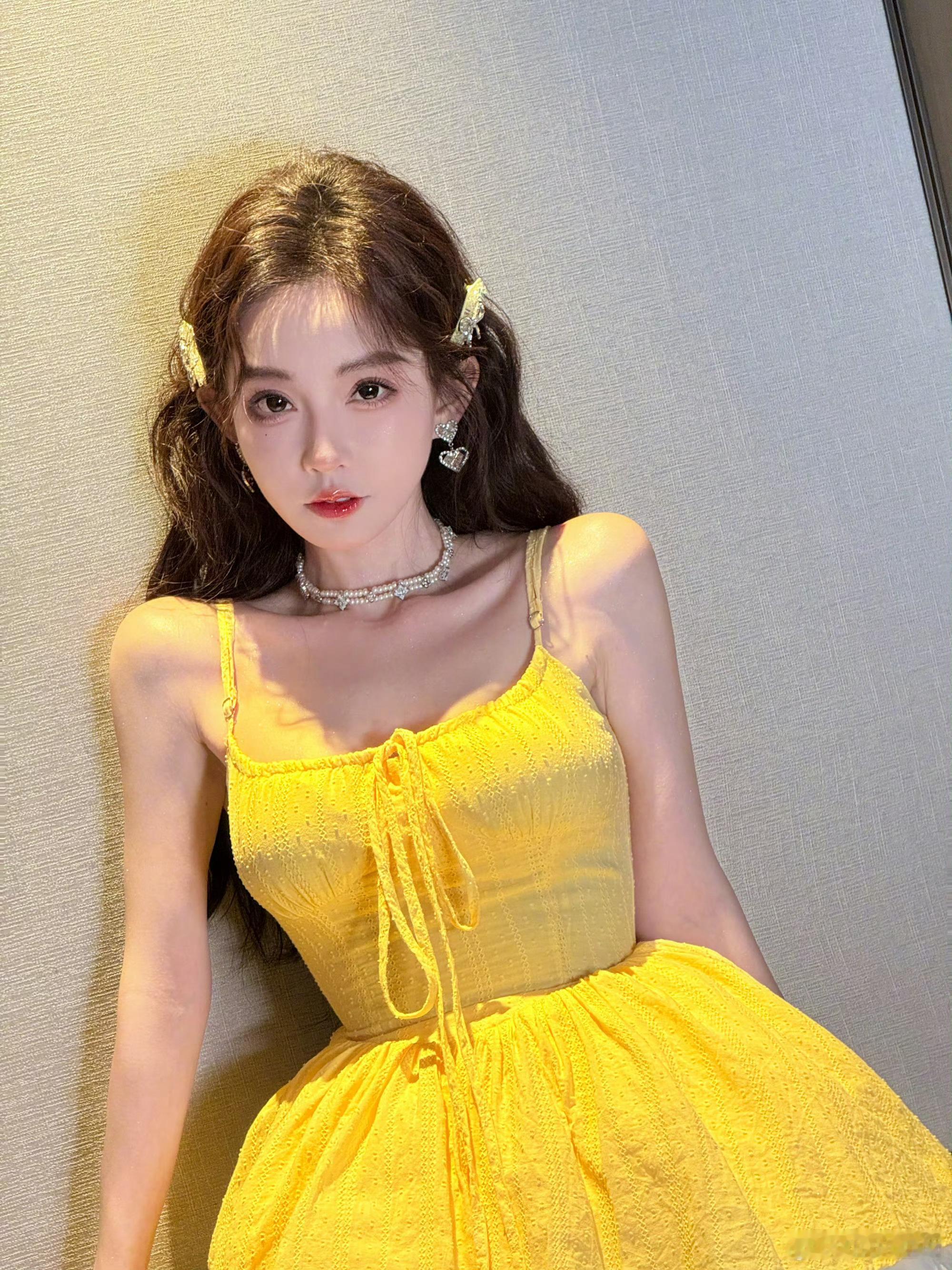 冯提莫瘦了50斤被冯提莫这条黄裙美到了!吊带设计露出精致的锁骨和肩颈线条,收腰又