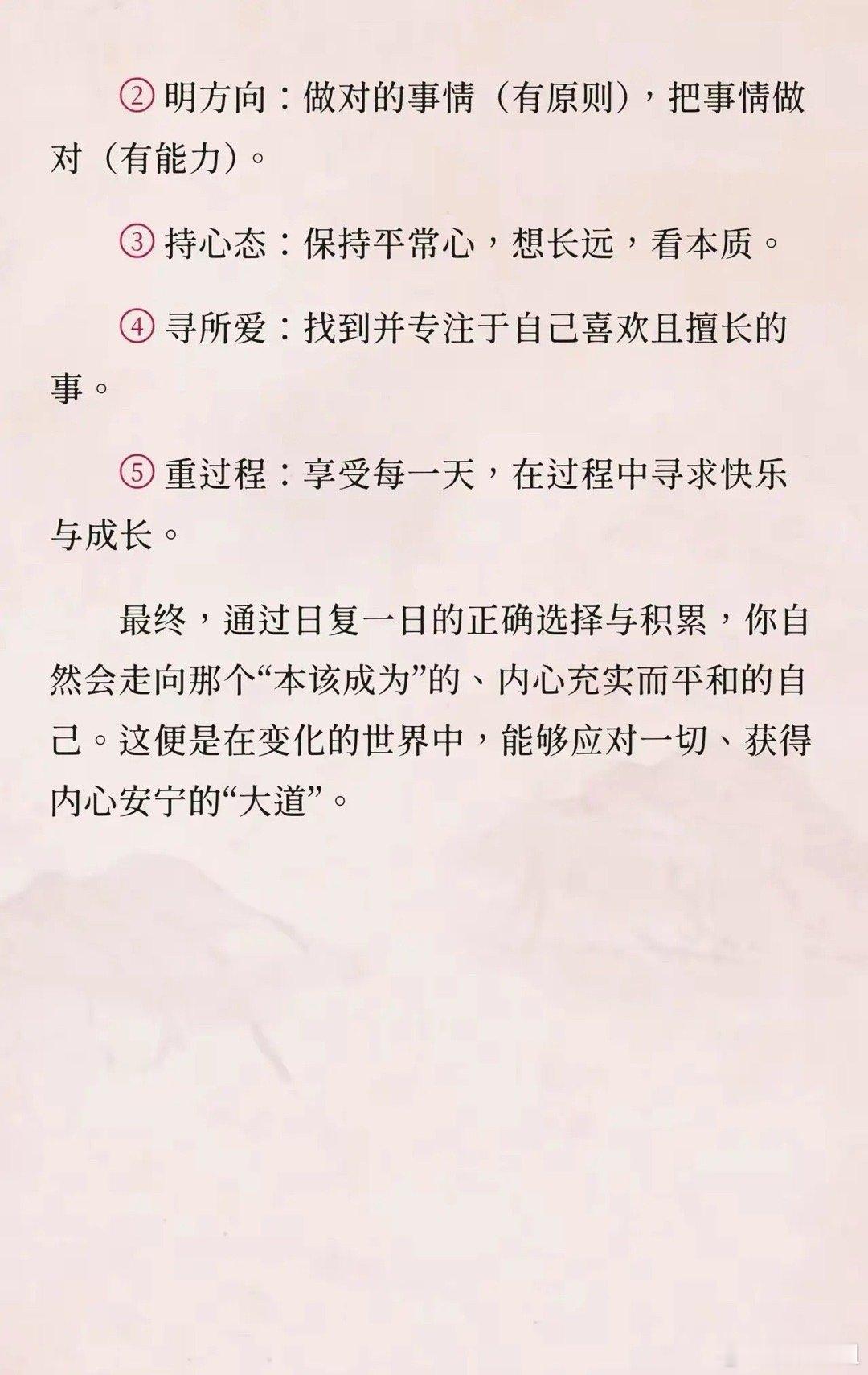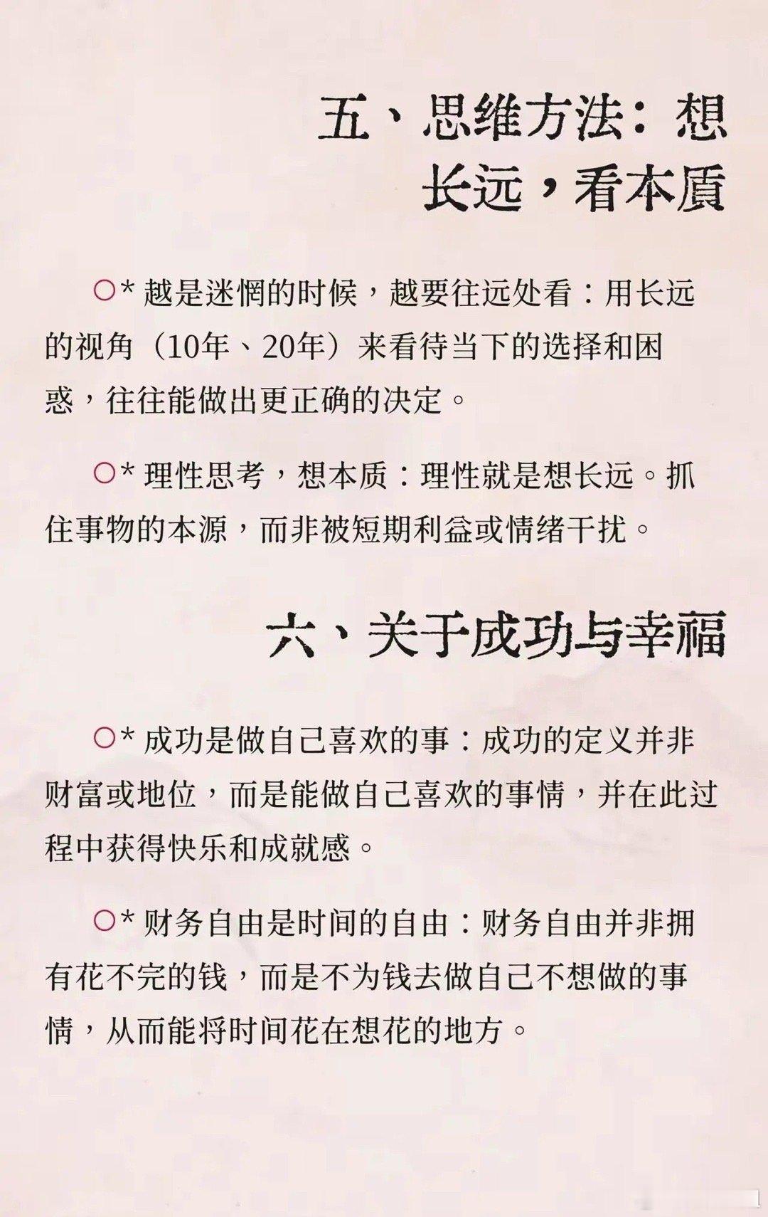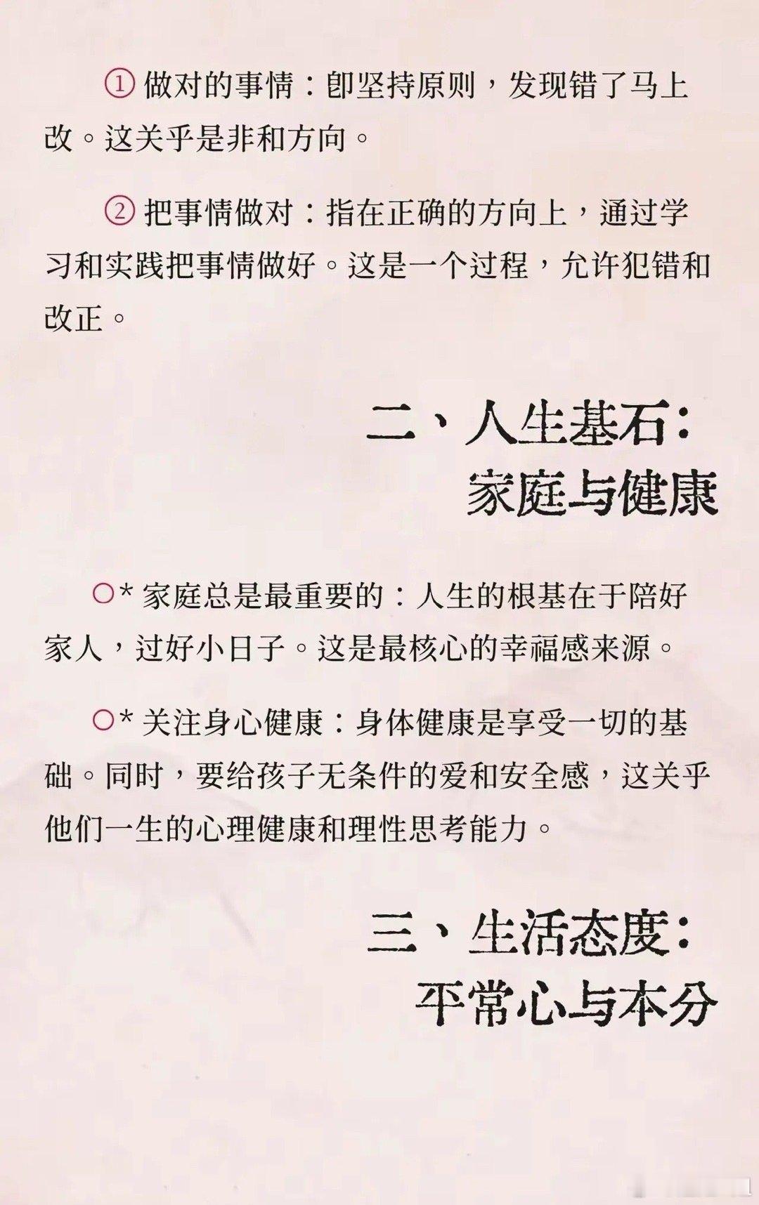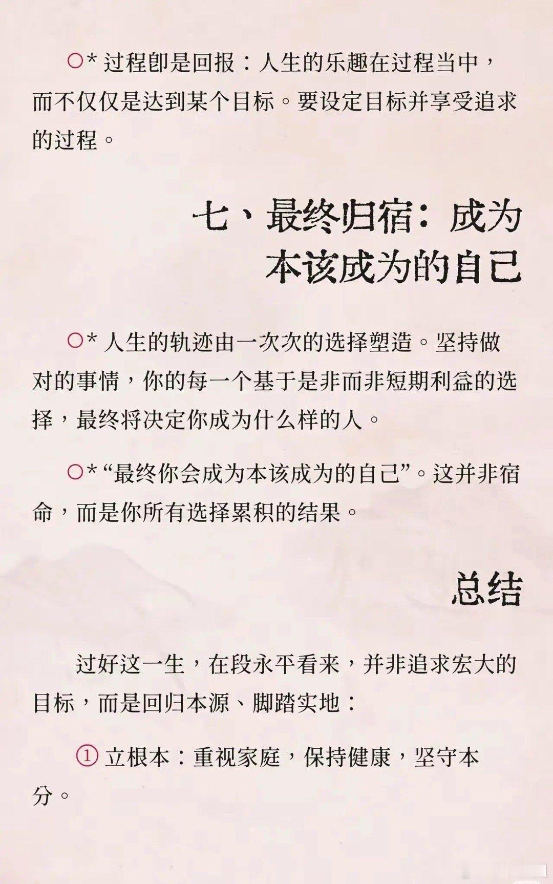 段永平的顶级人生智慧,越早看懂越受益!如果你的人生暂时不顺,一定要把这些话多看几遍。人生无法重来,但我们能做到下次不再犯错。在段永平看来,过好这一生,关键在于这7件事:1. 核心原则:做对的事情,把事情做对2. 人生基石:家庭和健康3. 生活态度:保持平常心,恪守本分4. 成长路径:专注聚焦,坚持学习5. 思维方法:立足长远,看透本质6. 成功与幸福:用心经营,知足常乐7. 最终归宿:成为本该成为的自己