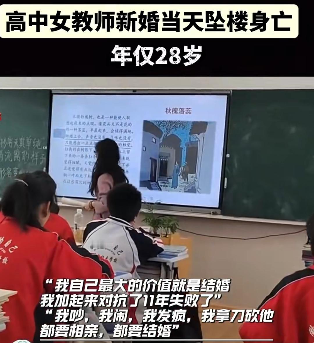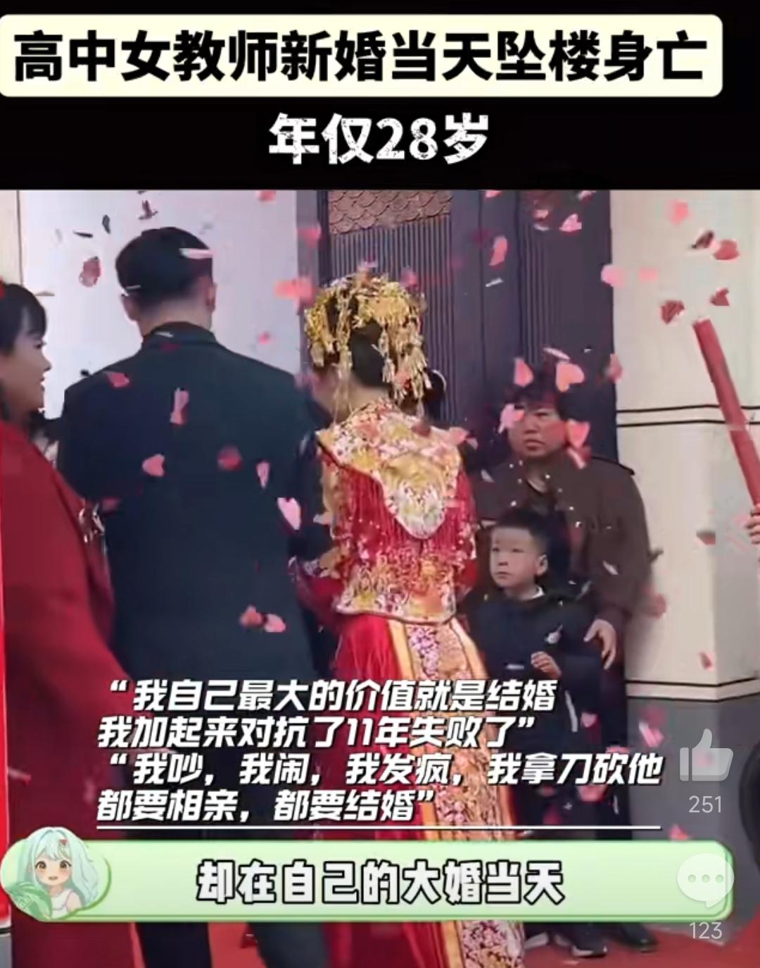 女教师结婚日坠楼:11年催婚压垮的何止是一个28岁的她?我们总说“坚持一下就好”,可漫无边际的压力,又能让一个人撑多久? 28岁,本该是人生刚铺开序章的年纪,一位女教师却在婚房里,以决绝的方式结束了自己的生命。11年催婚,从豆蔻年华到临近而立,她终究没能扛过家人的期盼、世俗的眼光,在本该满是祝福的婚礼日,选择与这个世界告别。 更让人痛心的是,她走后,遗体还因院落归属争议滞留一日,连最后的体面都成了奢求[流泪][流泪]。她明明能靠自己好好生活,可那句“有点害怕”里,藏着多少不被看见的无助?当“为你好”的催婚变成枷锁,当家庭从避风港变成风暴眼,到底是谁把她推向了深渊? 这场悲剧里,没有赢家。该如何打破“到年纪就该结婚”的规训,给那些不愿将就的人多一点包容?