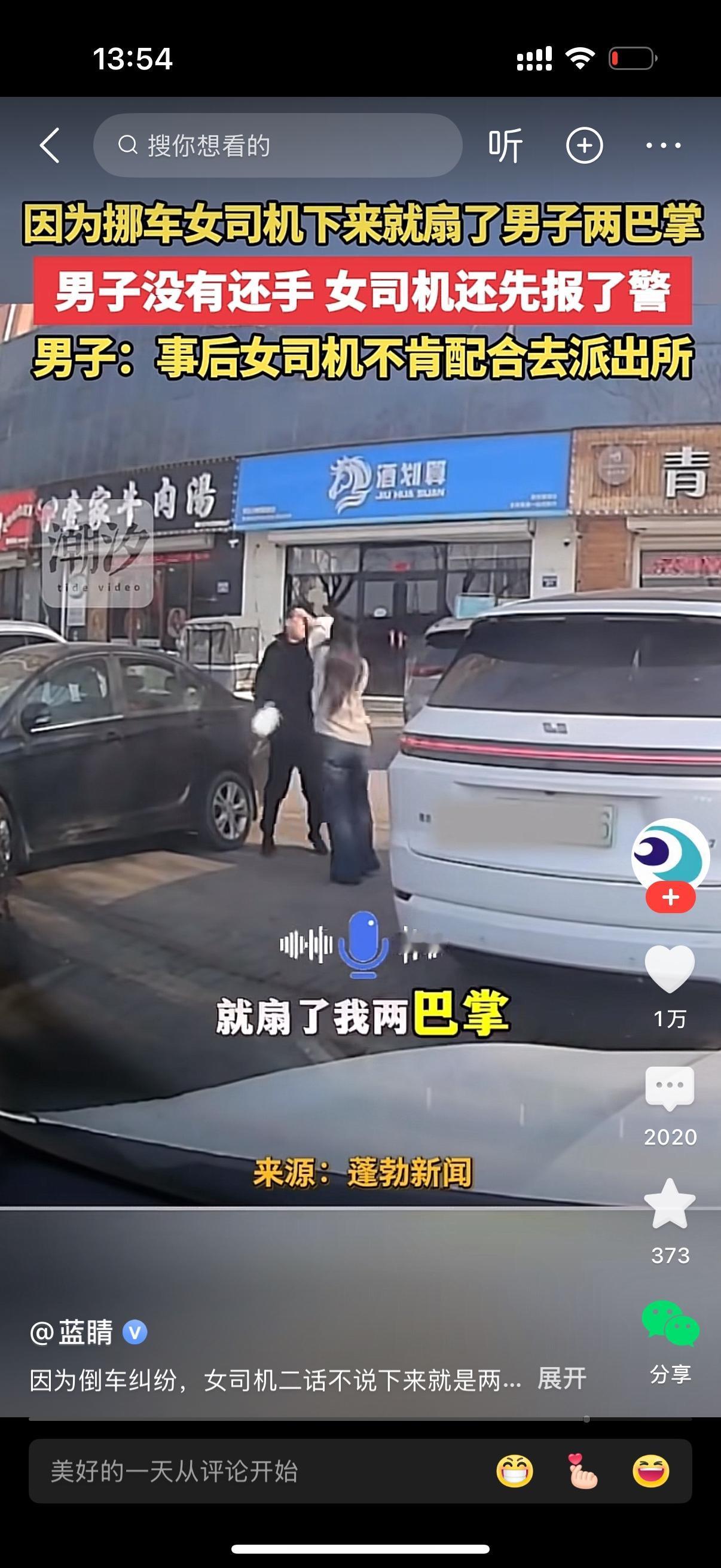 男子和朋友准备去驴肉火烧店。一个女子过来说你挪下车。男子就把车倒了一下,跟女的说只能这样了,没法再倒了。女的也不打方向,觉得还不行,男子说只能这样了,要不就这样待着。女子急眼了,直接冲下车,对着男人就扇了两巴掌。男子倒是能忍,没有还手,因为还手就是互殴啊。女子恶人先告状报了警,又不肯去派出所。你们说这都是啥样的女人?