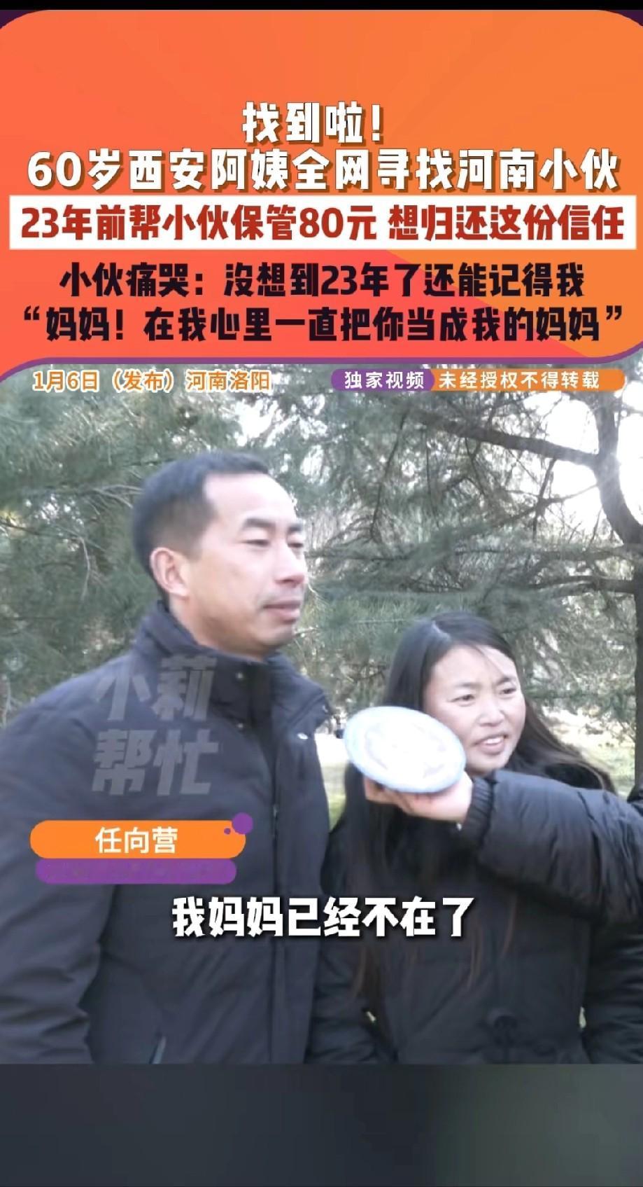 好消息!西安阿姨寻找的河南小伙找到了,小伙说他也一直在找阿姨,他记得阿姨对他的所有好。两个人还没见面,一开视频就都哭了。 这是一笔跨越了23年的“巨款”,数额仅仅只有80元。 在物价飞涨的今天,80块钱可能只是一顿普通的便饭,甚至买不来一件像样的衬衫。但对于家住陕西西安周至县的杨阿姨来说,这几十块钱沉甸甸地压在她心口,一压就是二十多年。 她无论如何也没想到,当年那个还没那个三轮车把高、在寒风里推着车卖馒头的河南小少年,会在23年后以这样的方式重新出现在她的生命里。更让她泪崩的是,随着这次重逢,一个被小伙子埋藏在心底多年的秘密终于揭开了——那从来都不是什么“存款”,而是一场为了维护尊严的报恩。 故事的缘起,并不只有简单的“保管”。把时钟拨回到2002年,杨阿姨的记忆里,总有一个让人心疼的身影。那时候的任向营还是个十几岁的孩子,父亲早逝,孤身一人从河南跑到西安周至讨生活。别的孩子还在父母膝下撒娇,他却要推着满载馒头的三轮车穿梭在陌生的大街小巷。 杨阿姨是个热心肠,看这孩子不容易,只要他路过门口,总要招呼进来吃口热乎饭,看他衣服脏了就顺手帮着洗洗。在任向营孤苦无依的少年时代,这点来自于陌生人的温暖,成了他最深的依恋。 那天,他掏出攒下的80元钱,怯生生地对杨阿姨说:“阿姨,我没银行卡,怕钱丢了,您能帮我存着吗?”杨阿姨没多想,只觉得这是孩子对自己的信任,郑重地答应帮他守好这份“积蓄”。 这一守,谁知就是杳无音信的23年。 就在今年1月5日,通过媒体《小莉帮忙》的牵线,杨阿姨终于通过视频连线见到了她苦寻多年的“孩子”。屏幕亮起的那一刻,两边的泪水都决了堤。杨阿姨第一眼就认出了他,哪怕当年的青涩少年如今已人到中年,哪怕时光改变了容颜,那种亲人般的直觉却没有断。 就在大家为“物归原主”而高兴时,任向营的一番话让在场所有人破防了。 面对杨阿姨执意要翻倍返还的钱款,任向营坚决不收。他红着眼眶道出了当年的真相:哪有什么“没卡怕丢”,那只是一个敏感少年的借口。 那时候的他身无长物,兜里这80块钱几乎是他的全部身家,他感念杨阿姨像妈妈一样给他做饭、洗衣、照顾受伤的他,想给钱表达谢意,又深知阿姨的脾气绝对不会收。于是,他编造了一个“保管”的理由,把钱留下了。 他本意是想偷偷留下这份心意,却没想到,这份善意的谎言,竟然让杨阿姨背负了23年的责任感。那个寒冷的冬天,他在春节前操作机器时不慎弄伤了手,大拇指肌腱受损伸不直,只能匆匆赶回河南老家治疗,这一走便断了联系。 视频那头,杨阿姨关切地问起:“你妈妈现在好吗?” 这句问候触到了任向营最痛的地方,他哽咽着告诉阿姨,自己的母亲早在2009年就因病离世了。这十几年里,他娶妻生子,在河南洛阳安了家,日子过得安稳,手上的旧伤也基本恢复了功能,但心里的那个位置一直空着。 虽然当年嘴上没喊过,但在心里,那个给他缝补洗衣、留饭知冷暖的杨阿姨,早就成了他精神上的母亲。 听到这里,杨阿姨再也控制不住情绪,掩面痛哭。这一声“儿子”,虽然迟到了二十多年,却在这一刻补全了两个人生命中的缺憾。任向营的妻子在一旁也早已泪流满面,她常听丈夫念叨这位西安的好心人,这份没有血缘的恩情,在他们的小家庭里被传颂了无数遍。 没有什么惊天动地的誓言,只有凡人之间最朴素的善良。杨阿姨当初满世界找人,只是为了完成一句“帮你保管”的承诺;而任向营当年的“托付”,却是一个困顿少年倾尽所有的报答。 杨阿姨当即发出了邀请:“儿啊,过年带着媳妇孩子回家来吧,家里人都在等着你!”任向营一家也爽快地答应了,这场跨越省份、穿越时光的团圆,已经预定在了即将到来的春节。 有人愿意为你守着80块钱苦等23年,有人在他最艰难的时候把你当成唯一的光。当亲情超越了血缘,这份人间真情比金子还珍贵。这个春节,西安周至的那顿团圆饭,注定会比往年更香、更暖。 参考信息:找到人啦!河南小伙的80元被陕西大娘保管了23年!小伙:嘴上说保管实际上是给她,一直把她当成我的妈妈...2026-01-06 19:21·大风新闻