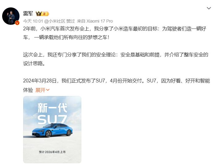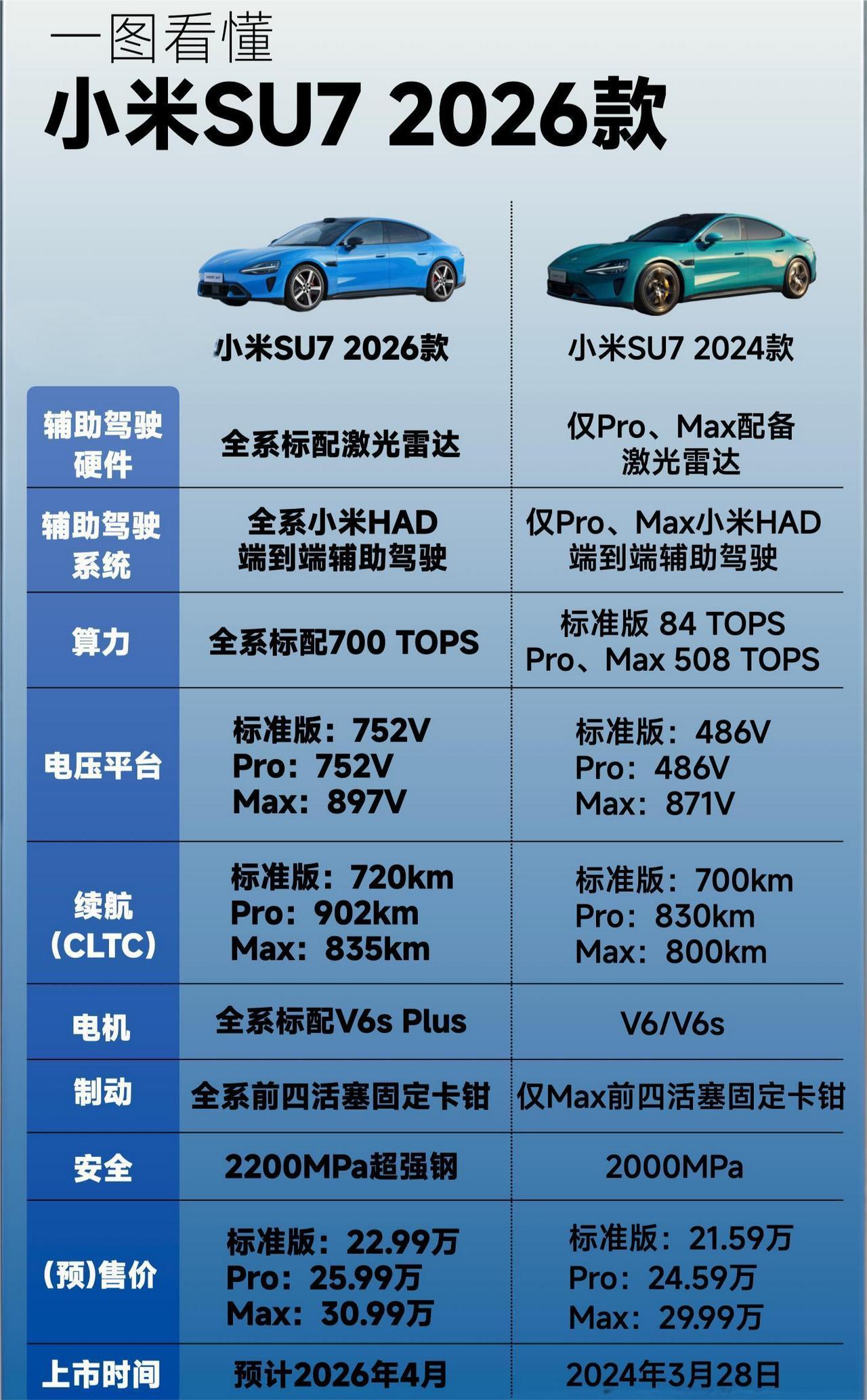2026 款小米 SU7 全方位焕新:22.99 万起的诚意,老款车主也被宠到 2026 年 1 月 7 日,雷军官宣的新一代小米 SU7 直接引爆车圈,这款预计 4 月正式上市的纯电轿跑,以 22.99 万起的预售价格,带来了堪称 “越级” 的全方位升级。对于手握老款订单的车主而言,限时升级政策更是诚意满满,让不少车友直呼 “这波换代太厚道”。作为一直关注小米汽车的爱好者,今天就带大家深度拆解这款新车的升级亮点。 一、价格持平配置拉满,老车主权益暖心 新一代小米 SU7 推出标准版 22.99 万、Pro 版 25.99 万、Max 版 30.99 万三个版本,价格与老款基本持平,但彻底告别了老款部分版本的配置阉割问题。核心硬件全系标配,让入门版车主也能享受到高规格配置。 更值得点赞的是老车主权益:锁单未交付的老款 SU7 车主可限时升级,不仅能按原订单顺序优先排产,保留原有购置税补贴权益,还能获赠价值 699 元的智能双表盘,截止时间为 1 月 10 日 24:00。相比不少车企换代后老车主 “被抛弃” 的情况,小米这波操作无疑收获了大量好感。目前新车小订已正式开启,1000 元意向金上市后可退,早订早提车的政策也让意向用户蠢蠢欲动。 二、续航补能跨越式提升,告别里程焦虑 纯电车主最关心的续航和补能问题,在新一代 SU7 上得到了彻底解决。老款长续航版 CLTC 续航最高 700 多公里,而新车 Pro 版直接飙升至 902km,Max 版也达到了同级领先水平。 平台方面,标准版和 Pro 版搭载 752V 碳化硅高压平台,Max 版更是升级至 897V 碳化硅高压平台,带来了极致的补能效率。根据常温环境下自营充电桩的实测数据,新车 15 分钟最快可补能 CLTC 续航 670km,相当于一杯咖啡的时间,就能满足长途出行的续航需求。无论是日常通勤还是跨城自驾,都无需再为找充电桩频繁驻足。 三、底盘性能全面进化,操控质感再升级 作为纯电轿跑,底盘和性能是核心竞争力。新一代 SU7 全系标配 V6s Plus 超级电机,相比老款电机性能大幅提升,同时全系配备前四活塞固定卡钳和后宽胎(前 245mm 后 265mm),胎宽优于老款,抓地力更稳,制动性能也更出色。 更重要的是,Pro 版和 Max 版新增闭式双腔空气弹簧系统 + CDC 阻尼可变减振器,这一配置在老款仅顶配车型才有,如今下放到中高配,让更多用户能享受到高级别的底盘调校。无论是过弯时的支撑性,还是面对颠簸路面的滤震效果,都比老款提升一个档次,驾驶质感更趋完美。 四、智能驾驶全系满配,入门即享顶配体验 智能驾驶是新一代 SU7 的一大亮点,新车直接将老款的 “选装项” 变为 “全系标配”。老款需要额外加钱选装的激光雷达、高阶辅助驾驶,如今全系标配,还升级了 700TOPS 辅助驾驶算力,搭配 4D 毫米波雷达和 Xiaomi HAD 端到端辅助驾驶系统,智能驾驶能力全面进化。 这意味着即便是买入门版的用户,也能享受到老款顶配的智能驾驶体验。城市 NOA、高速领航等功能的表现会更丝滑,无论是新手司机还是老司机,都能感受到智能科技带来的便捷与安全,大幅降低驾驶疲劳。 五、安全配置再加码,防护做到 “金钟罩” 级别 安全永远是汽车的基础,新一代 SU7 在安全配置上毫不吝啬。被动安全方面,采用 2200MPa 小米超强钢打造内嵌式防滚架,强度远超老款;气囊数量从老款的 7 个增加到 9 个,新增 2 个后排侧气囊,让后排乘客的安全得到更充分的保障。 电池安全更是做到了极致,新车配备 1500MPa 防刮底横梁 + 底部 “防弹涂层”,在老款扎实的防护基础上再添一层保障。即便行驶在烂路或复杂路况下,也无需担心电池受到磕碰,让用户用车更安心。 六、设计细节焕新,质感全面提升 虽然设计上没有颠覆性改动,但新一代 SU7 的细节升级同样戳人。外观上新增卡布里蓝车漆,搭配 20 英寸锋刃轮毂,造型比老款更具运动感和辨识度。内饰采用全新暗夜黑配色,方向盘、中控台、座椅和氛围灯均经过重新设计,彻底摆脱了老款内饰的塑料感。 新车在材质和做工上大幅提升,品质感显著增强,坐进车内能感受到更高级的驾乘氛围。简约而不简单的设计风格,既保留了小米的科技感,又提升了整车的豪华质感。 七、总结:诚意满满的全面焕新,性价比再创新高 新一代小米 SU7 并非简单的改款,而是从续航、性能、智能、安全到设计的全方位焕新。在价格与老款持平的情况下,实现了核心配置的全系拉满,还为老车主提供了暖心的升级政策,性价比直接拉满。 无论是追求长续航、强性能的驾驶爱好者,还是注重智能科技、安全配置的家庭用户,都能在这款车上找到满意的答案【来自懂车帝车友圈】