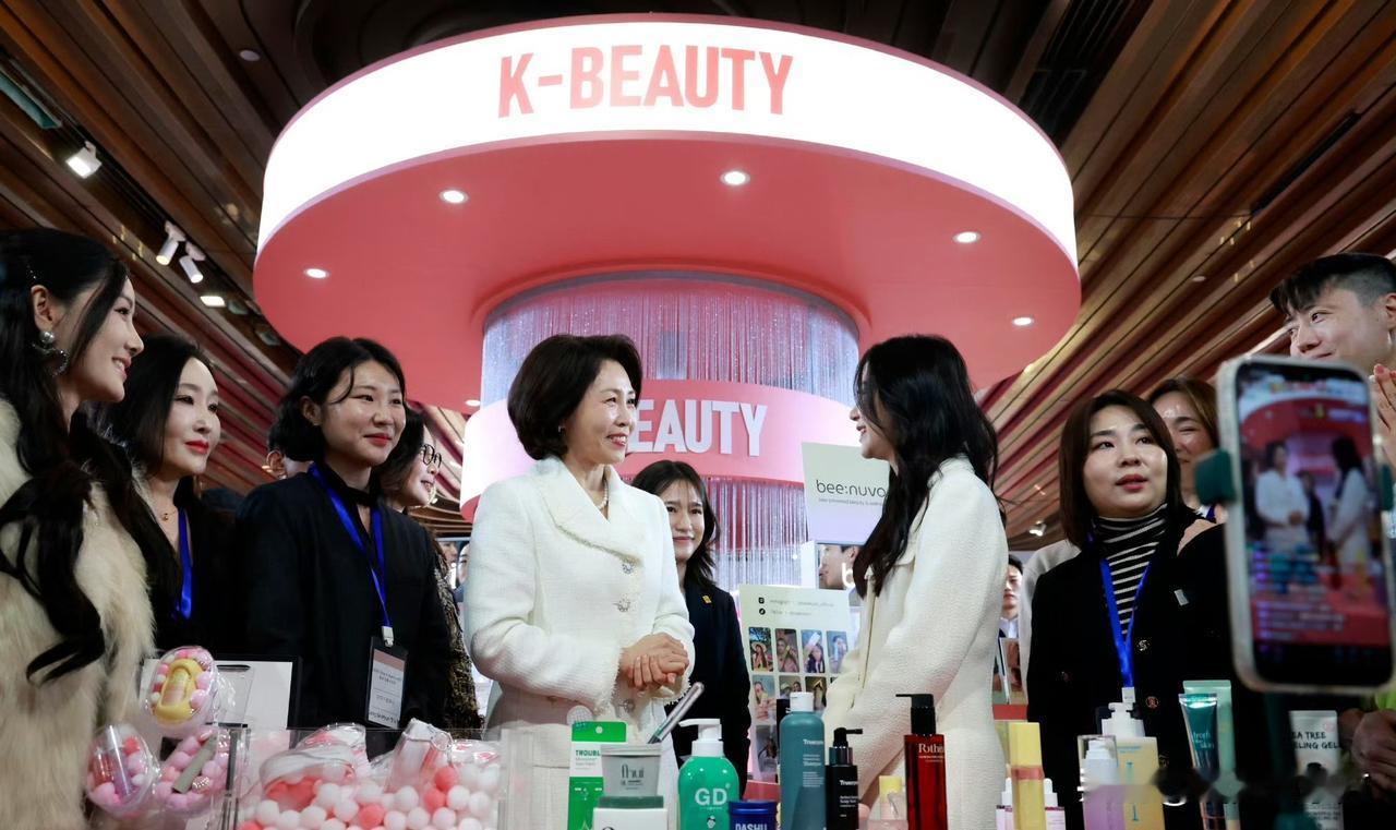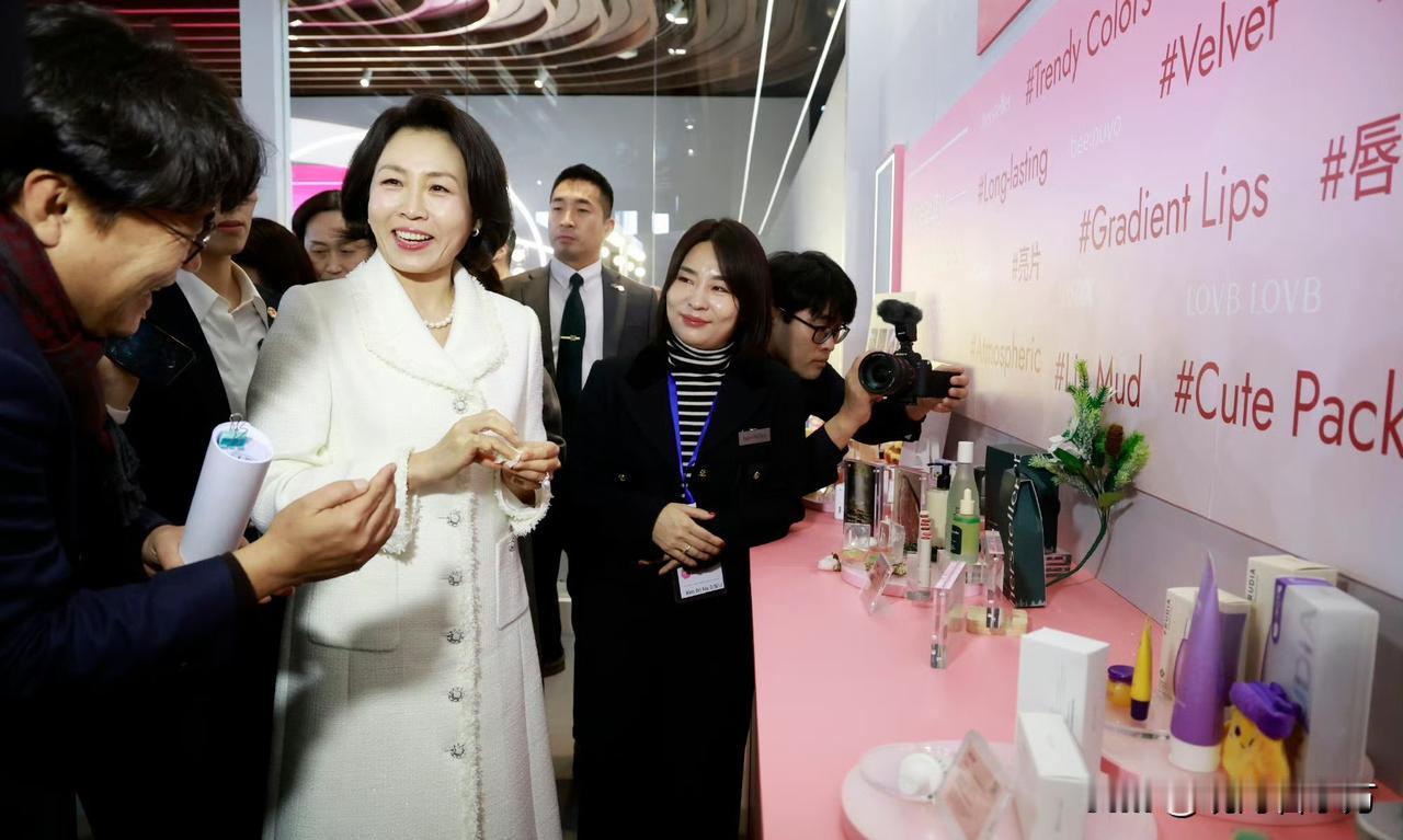 7日,陪同韩国总统李在明访华的金惠景女士在上海复兴艺术中心参加韩国美妆活动,亲自