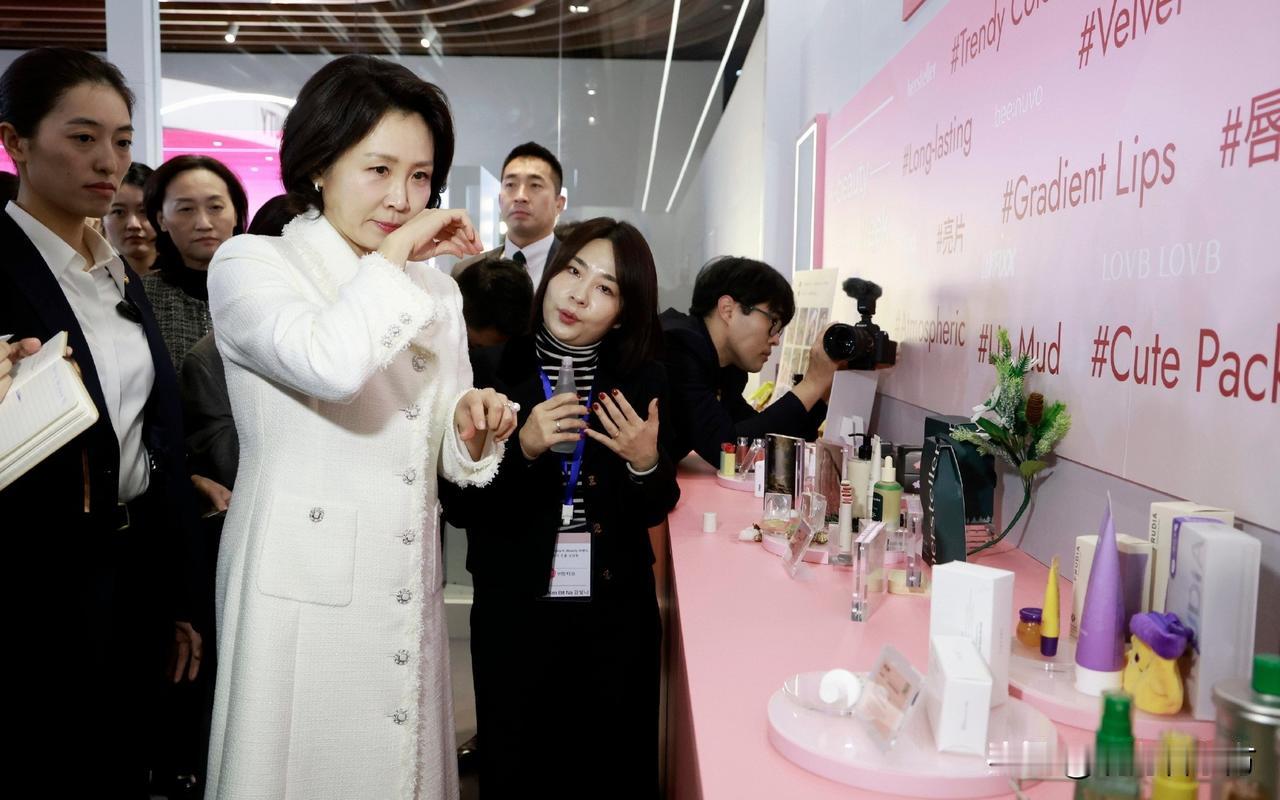 7日,陪同韩国总统李在明访华的金惠景女士在上海复兴艺术中心参加韩国美妆活动,亲自体验各式美妆产品。
