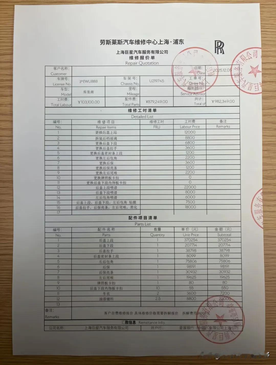 就这么点凹痕,居然修进去了一台奔驰S级!? 要么怎么说人家劳斯莱斯是顶级豪华呢! 以后看到那些愿意放走肇事者的劳斯莱斯、法拉利等顶级豪华品牌车主,可得好好地对人家感恩戴德……毕竟这种级别的车随便维修一下就是普通人的一辈子!! 再仔细看一下这张报价单,拆解车子给车主报维修价,这个拆解费用就要36000元了!预计维修工时费也达到了103100元!单单是工时费就亏了一台顶配卡罗拉!! 看到这,我也只能说一句,厉害!!!