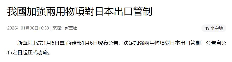 中国商务部正式宣布! 1月6日,中国官方宣布,受日本首相高市早苗涉台言论影响,从即日起,禁止所有军民两用物项输出日本。 中国商务部新闻发言人在官网就加强两用物项对日本出口管制答记者问时说:“日本领导人近期公然发表涉台错误言论,暗示武力介入台海可能性,粗暴干涉中国内政,严重违背一个中国原则,性质和影响极其恶劣。” 这类物项就是“一物两用”的关键物资,平时能用于民用生产,一旦被挪用就能直接提升军事潜力,小到制造芯片的锗材料、生产精密仪器的机床,大到航空航天所需的复合材料、稀土制品都在此列。 中方这次直接全面禁运,相当于掐住了日本制造业和军工体系的“命门”,绝非普通的贸易摩擦那么简单。 日本制造业有多依赖中国的军民两用物项?说出来可能超出很多人的想象。比如制造电动汽车电机、精密芯片不可或缺的中重稀土,日本几乎100%依赖中国进口;用于化肥和军工材料的磷酸铵,90%以上来自中国;还有生产半导体的锗材料、航空航天用的高性能复合材料,中国都是日本最主要的供应国。 日本有1500多家企业参与军事产品制造,这些企业的产业链和民用制造业深度绑定,中方的禁运不仅堵死了直接出口的通道,还明确规定任何第三方转售都要追责,等于彻底封死了日本“绕道采购”的可能。 中方禁令一公布,日本立刻慌了神。日本外务省亚洲大洋洲局局长金井正彰急着向中方提“强烈抗议”,还倒打一耙说中方措施“不符合国际惯例”。 可这种辩解根本站不住脚,要知道出口管制是全球通行的做法,美国有《出口管制法》,欧盟也有专门的两用物项管制条例,中方这次的行动完全依据《中华人民共和国出口管制法》和《两用物项出口管制条例》,合法合规,有理有据。 而且中方早就提前预警过,去年12月商务部发言人就明确表示,若日方一意孤行,一切后果由日方承担,现在不过是“言出必行”而已。 日本野村综合研究所做过测算,要是稀土进口受限持续一年,日本名义和实际GDP都会减少0.43%,这还只是单一品类的影响。 这次中方禁运的是所有军民两用物项,涵盖1030多个品类,涉及半导体、航空航天、医疗设备等多个关键领域,这些品类占日本自华进口总额的42%左右。 对日本企业来说,短期内根本找不到替代供应商,就算有战略储备,也撑不了太久,毕竟很多核心材料的技术门槛高、生产成本大,“供应链多元化”只是日本的一厢情愿。 其实中方这步棋,不仅是反击日本的涉台挑衅,更是向所有外部势力释放明确信号:台湾问题是中国的核心利益,任何试图干涉的行为都要付出沉重代价。 从历史上看,中国曾经长期遭受西方的技术封锁,而现在我们之所以能主动实施出口管制,靠的是多年来在核心材料、关键技术领域的积累,这也是国家实力的体现。 国际社会也对中方的立场大多表示理解,毕竟谁都明白,尊重国家主权和领土完整是国际法的基本准则,日本的挑衅才是破坏地区和平稳定的根源。 现在高市早苗政府还在嘴硬,一边喊着“希望扭转中日关系”,一边却不撤回错误言论,还在推进安保文件修订,这种“两面派”做法根本骗不了人。 中方的禁运措施已经生效,后续还可能进一步收紧稀土相关物项的出口审查,日本要是再不认清现实,只会让自己的产业陷入更被动的境地。 国家之间的交往讲究的是相互尊重,日本既然敢突破一个中国原则的红线,就必须承担相应的后果。 中方的反制不是为了挑起冲突,而是为了维护国家主权和领土完整,维护二战后形成的国际秩序。 希望日本能早日清醒过来,撤回错误言论,用实际行动修复中日关系,否则再多的辩解也没用,只会让自己在国际上越来越孤立。