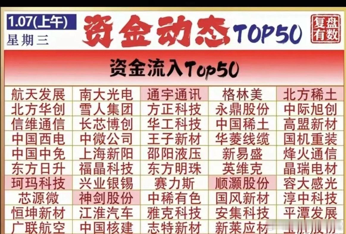 1.7午盘主力资金净流入个股梳理主力资金聚焦半导体、新能源、通信设备、稀土永磁等赛道,科技自主可控与高端制造成核心主线,半导体产业链、AI算力光通信板块受追捧,稀土、新能源材料等周期成长标的同步获布局。核心个股梳理1. 半导体(设备/材料/芯片):南大光电(ArF光刻胶国产突破)、北方华创(半导体设备龙头)、中微公司(5nm刻蚀机突破)、长芯博创(存储芯片国产替代)、上海新阳(电镀液/光刻胶客户认证推进)2. 通信/算力:通宇通讯(5G+卫星通信)、中际旭创(全球光模块龙头,800G量产)、永鼎股份(5G光模块+超导技术)、烽火通信(光通信及5G设备龙头)3. 新能源/稀土:格林美(动力电池回收龙头)、北方稀土(全球稀土龙头)、中国稀土(稀土资源整合平台)、雪人集团(氢能全产业链布局)4. 高端制造/其他:航天发展(国防信息化核心)、华工科技(激光设备龙头)、中国西电(特高压设备龙头)、国机重装(重型装备制造)、中国中免(免税龙头)总结资金密集布局硬科技高景气赛道,半导体产业链、AI算力基础设施为核心方向,稀土、新能源材料等周期成长标的同步受青睐,技术壁垒高、国产替代逻辑清晰的龙头标的成资金首选。