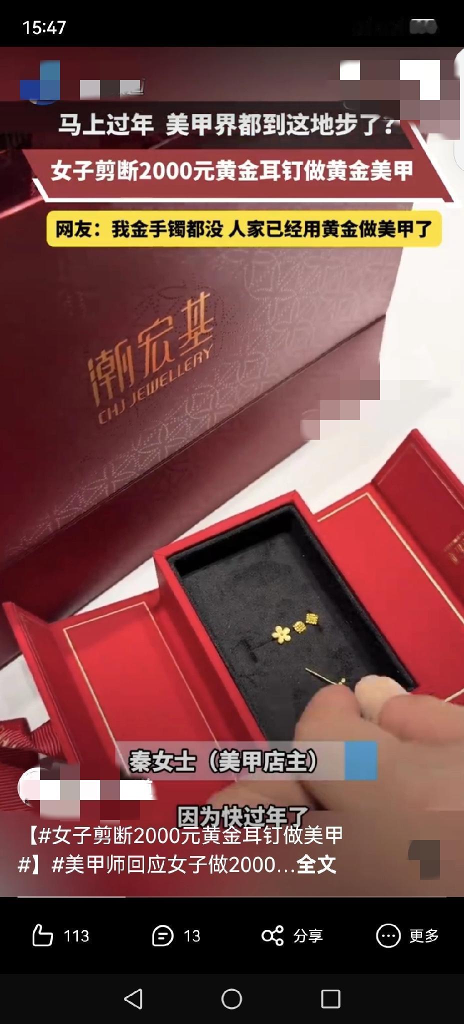 河北石家庄最近出了件新鲜事儿,一女子竟把价值2000元的黄金耳钉给剪断,拿去做了美甲!这事儿是美甲店店主秦女士证实的,确实有这么回事。据秦女士说,这顾客来店里,就提出要把自己的黄金耳钉改造成美甲装饰,秦女士一开始也挺惊讶,但顾客坚持,她也就照做了。 现在大家生活水平提高了,对美的追求那是越来越多样。年底到了,很多人都想换个新形象,美甲作为能快速提升精致感的方式,自然成了热门选择。这顾客估计就是想在众多美甲中脱颖而出,追求那种独特又奢华的感觉,才想出把黄金耳钉用上的主意。 不过这事儿也引发了不少讨论。有人觉得这太奢侈了,2000元的耳钉就这么剪了,有点浪费;但也有人觉得,只要自己乐意,钱怎么花是个人自由,追求独特美也无可厚非。 其实,每个人都有自己的审美和消费观念,在能力范围内让自己开心、满足,也没什么不对。就像这女子,她可能觉得用黄金耳钉做美甲能给自己带来不一样的体验和快乐。 不管怎么说,这事儿也算是给大家打开了新思路,原来美甲还能这么玩。不过大家在追求独特的同时,也得考虑好自己的经济实力,理性消费,可别盲目跟风啦。 你认为其女子做法如何,欢迎来评论区讨论。