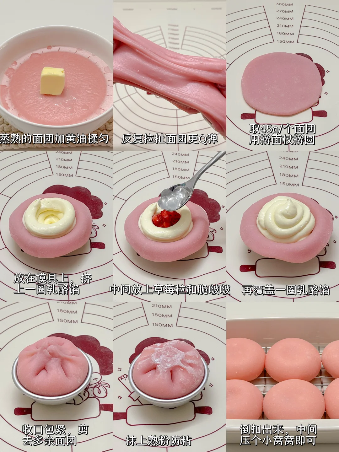 3️⃣蒸熟的面团加黄油揉匀,反复拉扯面团更Q弹,取45g/个的面团擀圆,放在雪媚娘模具上,挤上一圈奶酪馅,中间放上草莓粒和脆啵啵,再覆盖一圈乳酪馅,收口包紧,剪去多余面团,抹上熟粉防粘,倒扣出来,中间压个小窝窝即可。