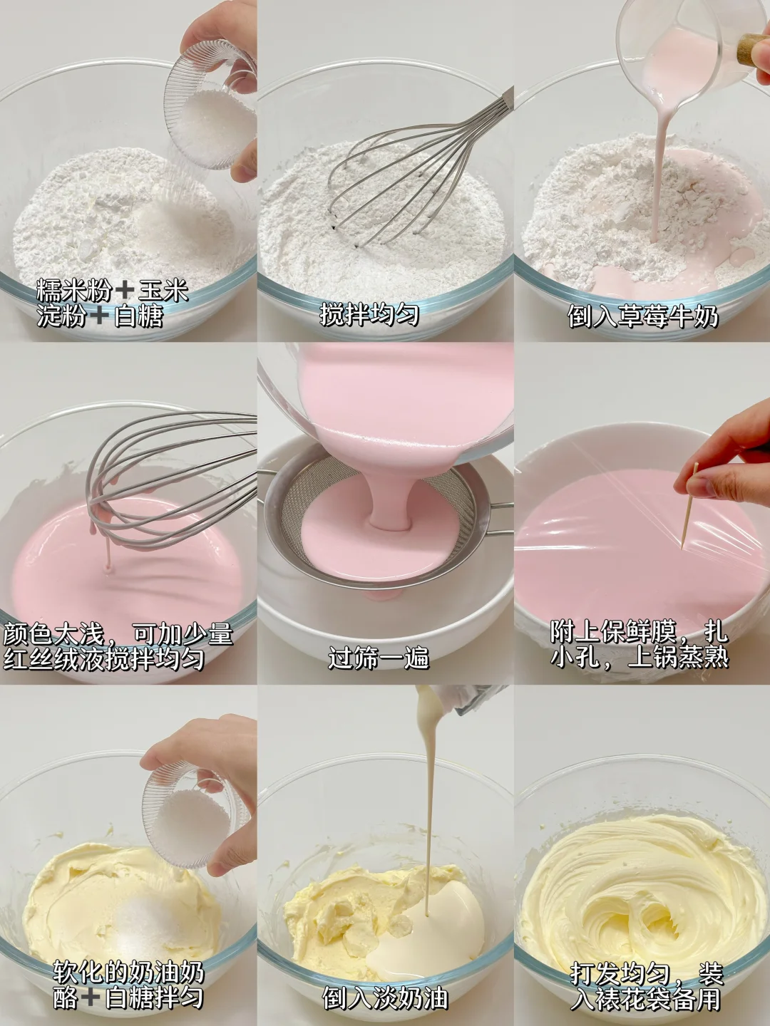 1️⃣糯米粉+玉米淀粉+白糖搅匀,倒入草莓牛奶,颜色太浅可加少量红丝绒液搅拌均匀,过筛一遍,附上保鲜膜,扎几个小孔,上锅蒸25分钟左右。