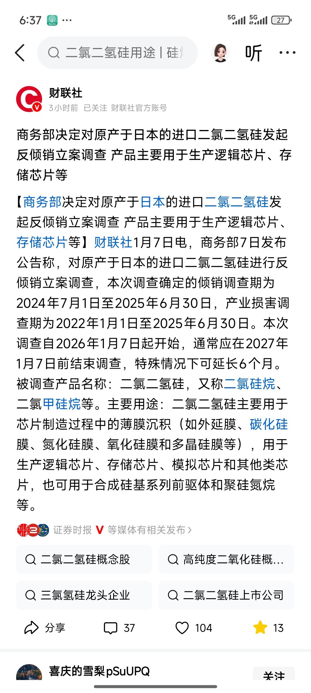 今天,商务部对自日本进口的二氯二氢硅发起反倾销调查。如今,中国开始对日本“出拳”反击了。此次反击大概率会利好相关A股的替代产品,替代产品概念又将引发一番炒作。我们要积极关注,也可提前潜伏。涉及的可能还有光刻胶、相关气体等。 欧盟对华反倾销 反倾销制裁 临时反倾销措施 中国商品倾销 美国反倾销产品 对美反倾销 临时反倾销