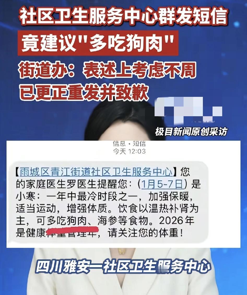 四川雅安一社区服务中心,给居民朋友发短信杨幂寒冷的冬天多吃狗肉,令很多爱狗人士的不满。社区服务中心回应,确实发短信之前考虑不周,已做更正和道歉。自古以来吃狗肉能保暖,也是国内某些地区人民的一种习惯,但毕竟发这样的公众信息还是需要谨慎,避免引起舆论。