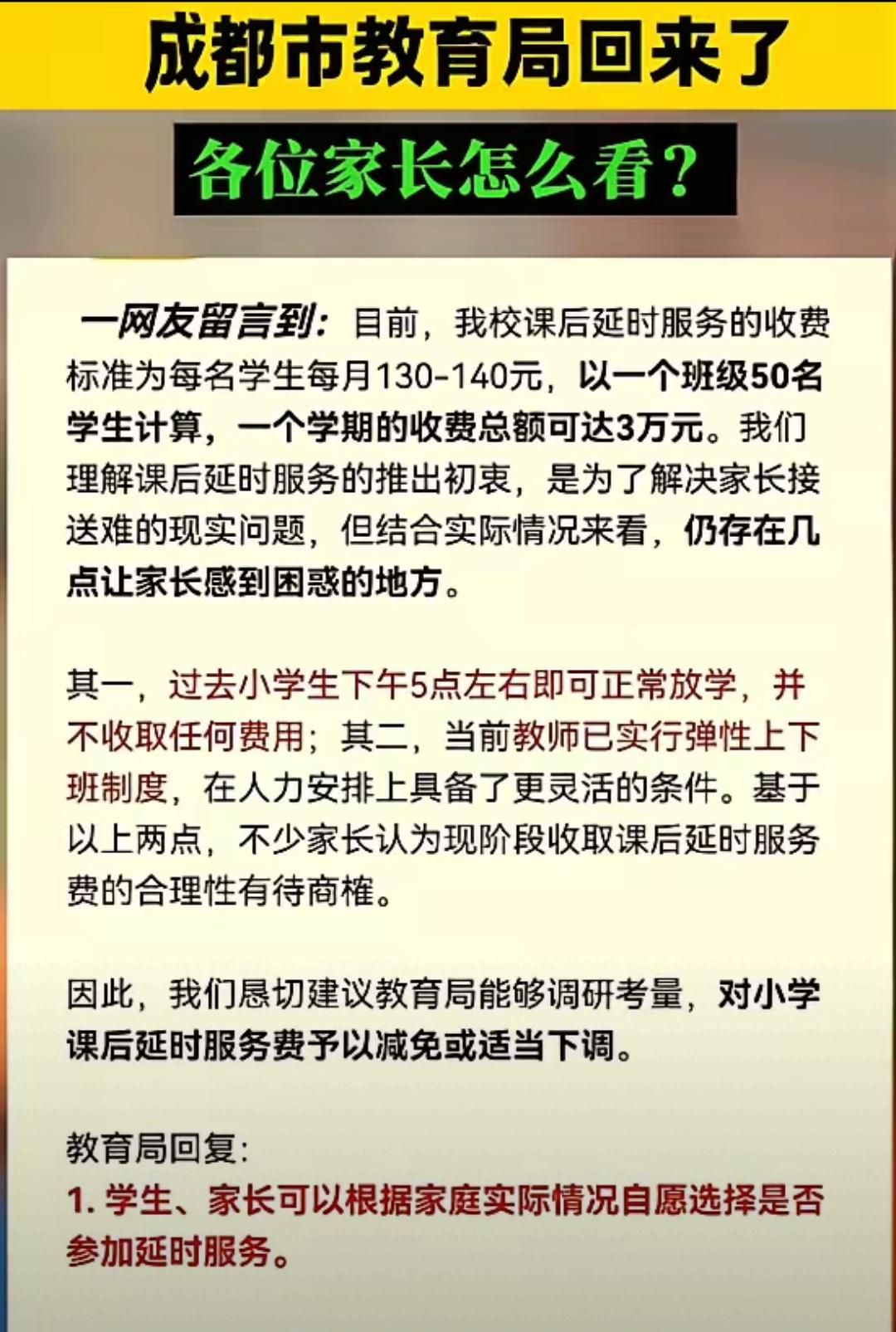 成都家长吐槽延时费!绕回五点放学还加钱,问题核心根本不是时间 成都家长这波吐槽太戳心了!小时候五点放学不用花钱,现在先把放学提前到四点,再整个延时课绕回五点,反而每月要多交一笔费,这操作谁看了不懵? 其实延时课的初衷是帮双职工家庭解决“接娃难”,本是好事。可现在不少地方变了味,要么“自愿”变强制,要么只看纪律不辅导作业,甚至用延时课讲新课,让没报名的孩子跟不上。家长不满的不是花钱,是花了钱没享到对应服务,反而像为原本该有的放学时间买单。 真正的延时服务,该是按需选择、物有所值,而不是搞形式主义。你家孩子上延时课是真受益,还是被迫“凑数”?