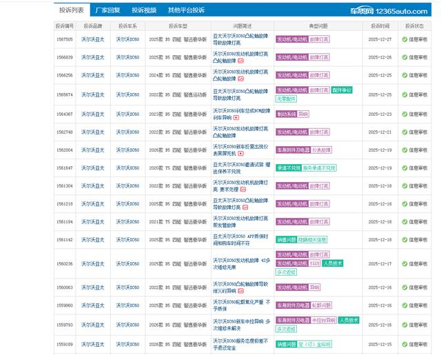 据车质网最新数据,2024年涉及沃尔沃B系列发动机凸轮轴故障的投诉量同比激增137%,2025年10月至12月,关于沃尔沃凸轮轴故障的投诉近百起,较2024年同期有大幅增长。