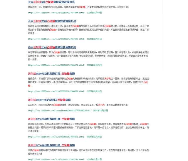 记者在车质网、汽车论坛的搜索框内输入“沃尔沃凸轮轴”,经检索发现,相关投诉帖达数百条,多个维权群人数超百人,车主们甚至把凸轮轴称作“凸轮咒”。