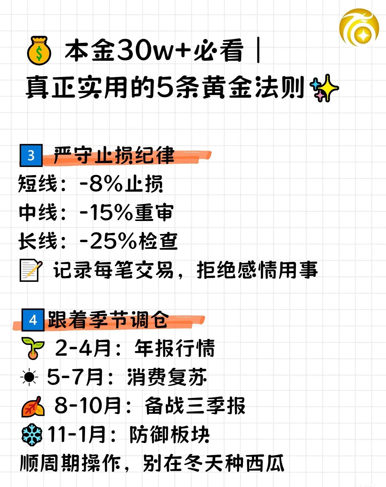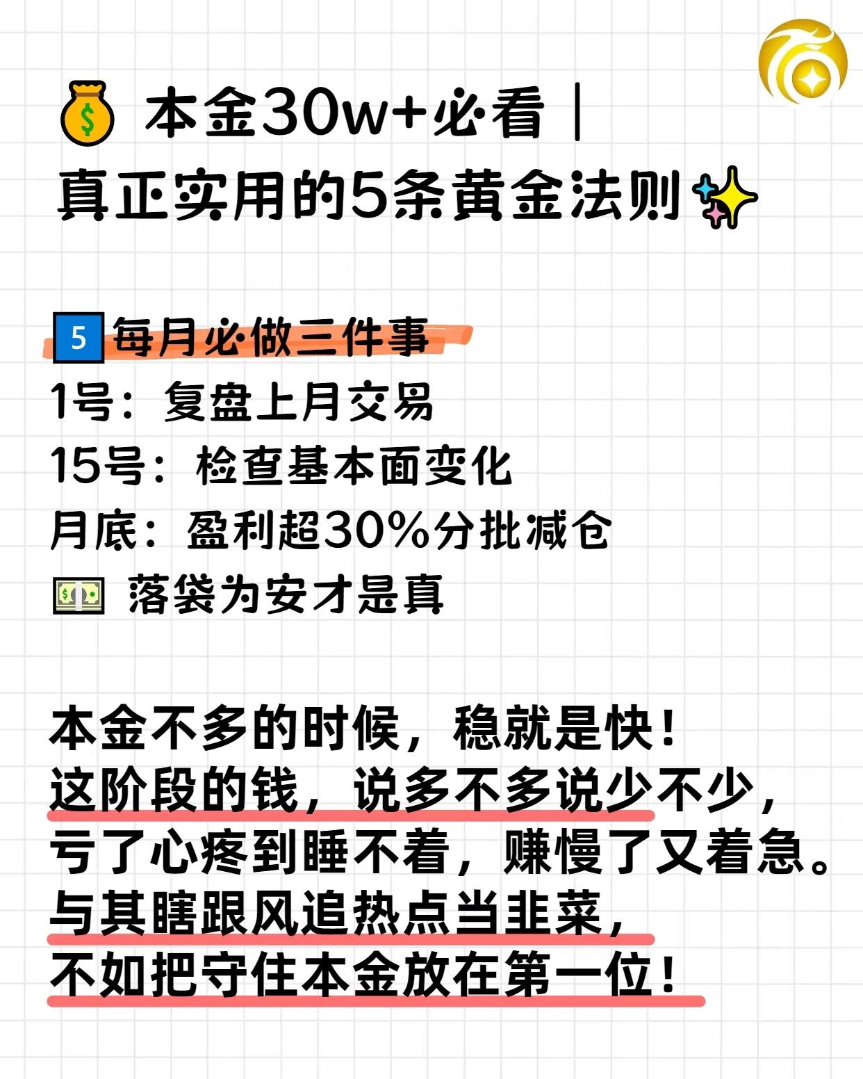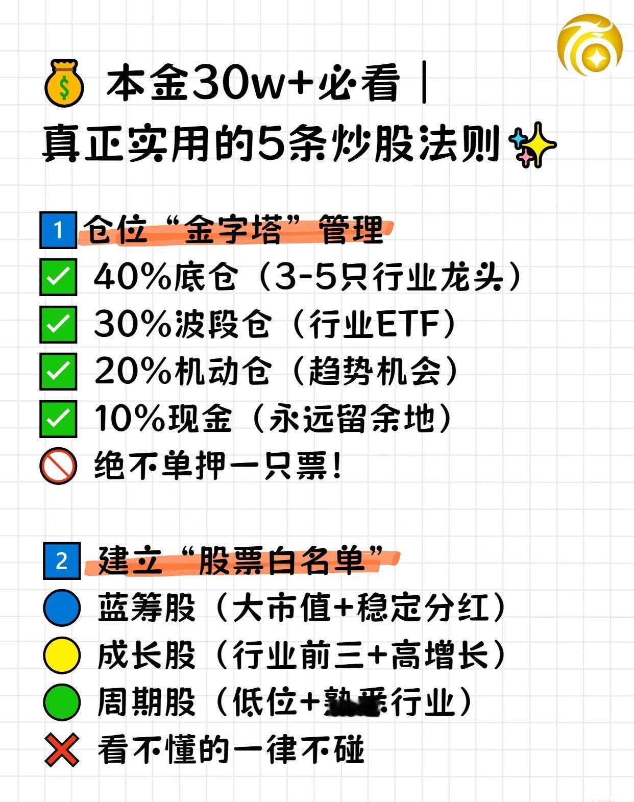 本金30万+必看|实用的5条炒股黄金法则 如果你已经有二三十万本金投入股市,请务必牢记以下五条法则,它们能帮助你在波动的市场中更好地保护并增值资产。 1. 仓位“金字塔”管理 - 40% 底仓:配置3–5只行业龙头股,确保基础稳定性。 - 30% 波段仓:投资行业ETF,把握阶段性机会。 - 20% 机动仓:用于捕捉趋势性行情。 - 10% 现金:始终保留一定流动性,绝不全仓押注一只股票。 2. 建立“股票白名单” - 蓝筹股:大市值 + 稳定分红。 - 成长股:行业前三 + 高增长潜力。 - 周期股:低位布局 + 熟悉行业。 - 原则:看不懂的行业或公司,一律不碰。 3. 严守止损纪律 - 短线:亏损达 8% 坚决止损。 - 中线:亏损达 15% 重新审视策略。 - 长线:亏损达 25% 检查投资逻辑。 - 记录每一笔交易,避免情绪化决策。 4. 跟着季节调仓 - 2–4月:关注年报行情。 - 5–7月:布局消费复苏。 - 8–10月:备战三季报。 - 11–1月:转向防御板块。 - 顺周期操作,避免在错误的时间追逐不匹配的机会。 5. 每月必做三件事 - 1号:复盘上月交易,总结经验。 - 15号:检查持仓公司基本面变化。 - 月底:若盈利超过 30%,分批减仓,落袋为安。 - 记住:本金不多时,稳就是快。守住本金比盲目追热点更重要,因为一旦亏损,影响的不仅是财富,还有心态与生活质量。 这套法则的核心在于分散风险、严格纪律、顺势而为、及时兑现,适合有一定本金且希望稳步增长的投资者。