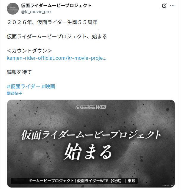 《假面骑士》55周年纪念电影企划官宣,详情将于北京时间1月27日上午11点公开。