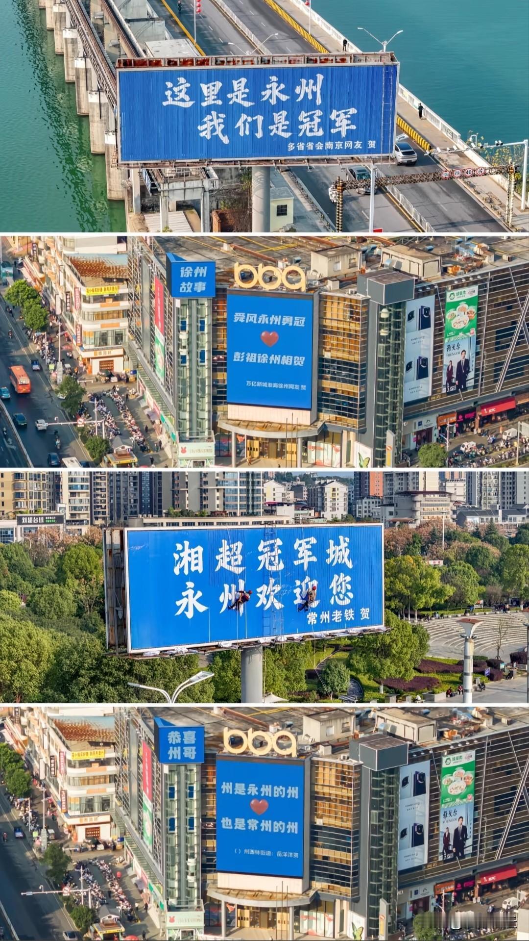 2025年12月27日晚,湖南永州队击败常德队,勇夺湘超联赛冠军。在颁奖仪式上,四万多名观众同声高唱《真心英雄》。谁能想到,这场胜利竟触发了一场横跨千里的“灯牌会战”。 苏州网友封先生被永州的足球热忱所感染,出资一万元在永州宋家洲大桥桥头设立了“这里是永州,我们是冠军”的祝贺广告。这一创意迅速扩散,南京网友紧跟而上,两块广告一左一右,十分惹眼。截至目前,江苏“十三太保”的广告牌均已安置妥当,部分县级城市的广告牌也在制作当中!这般操作,直接把永州推成新年“网红”之地,着实了不起!