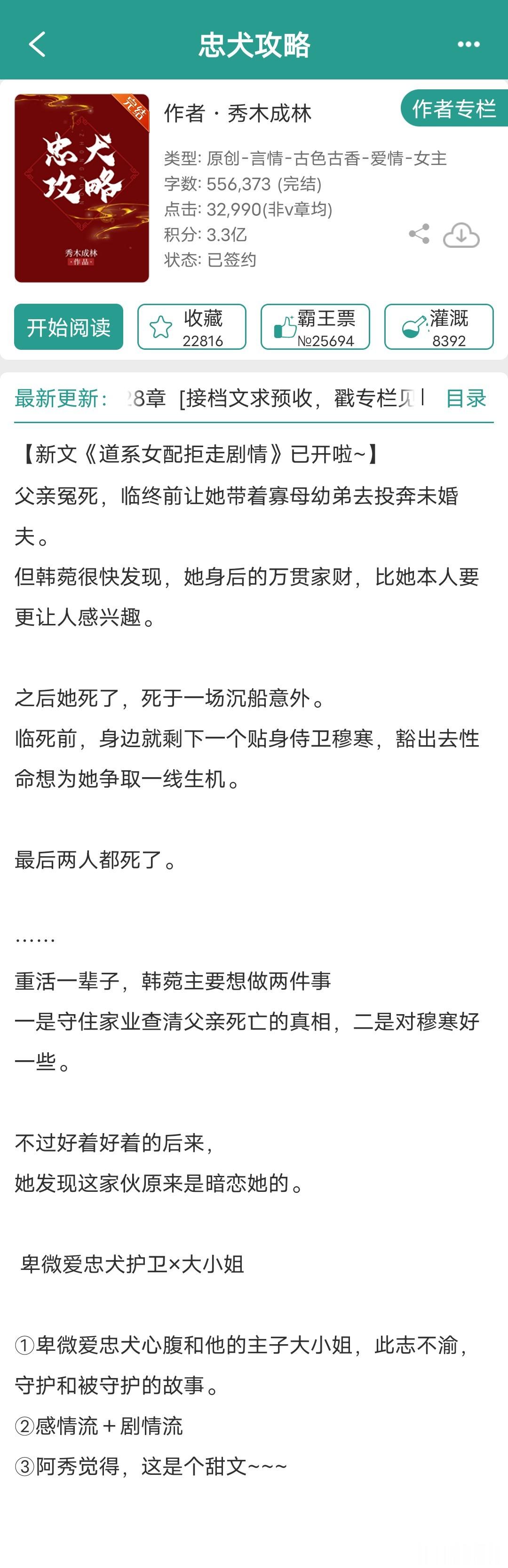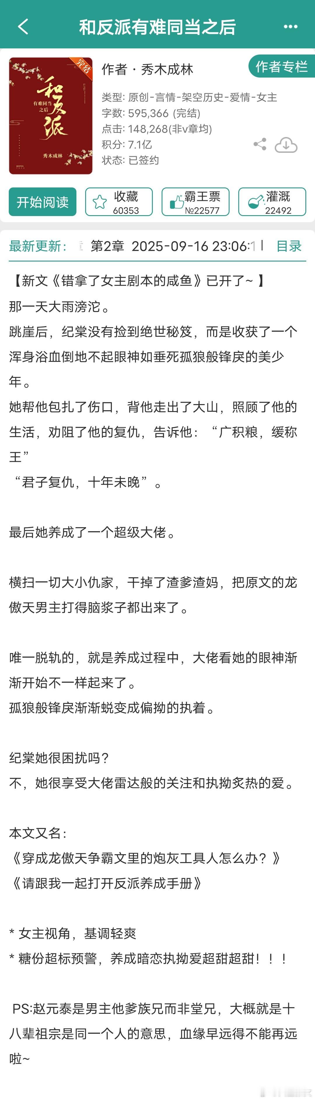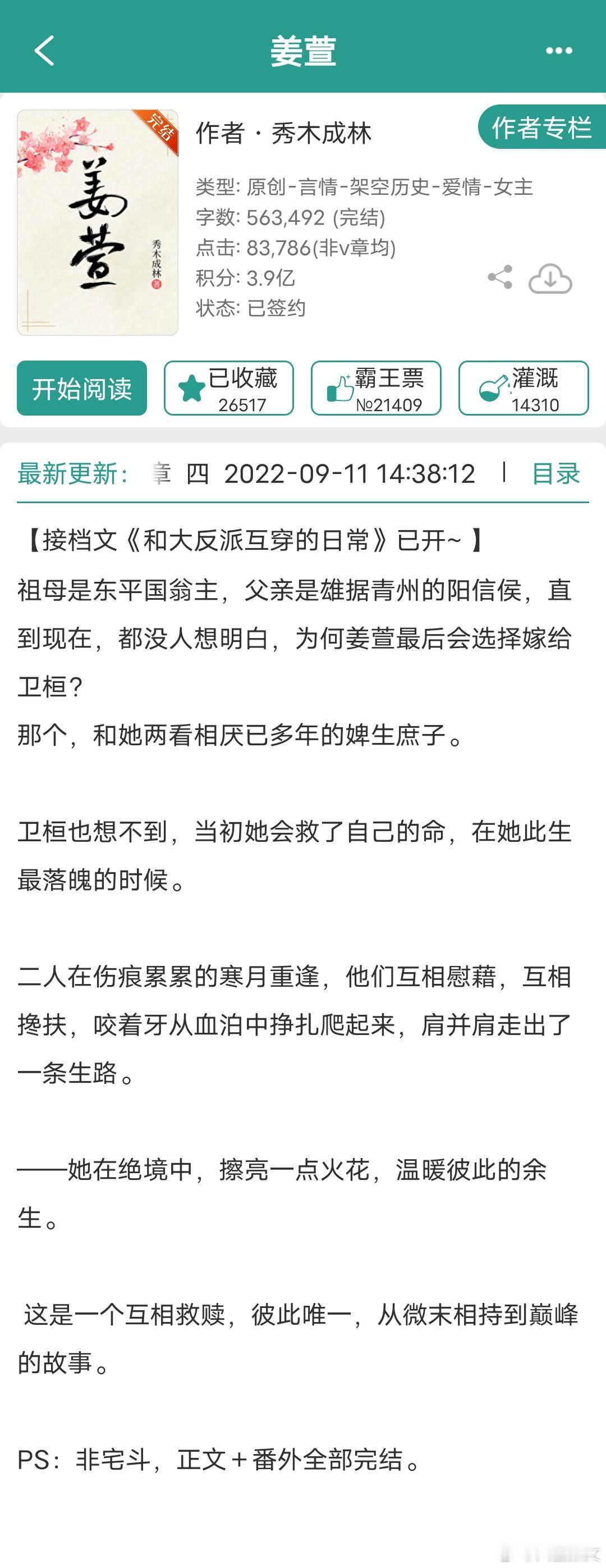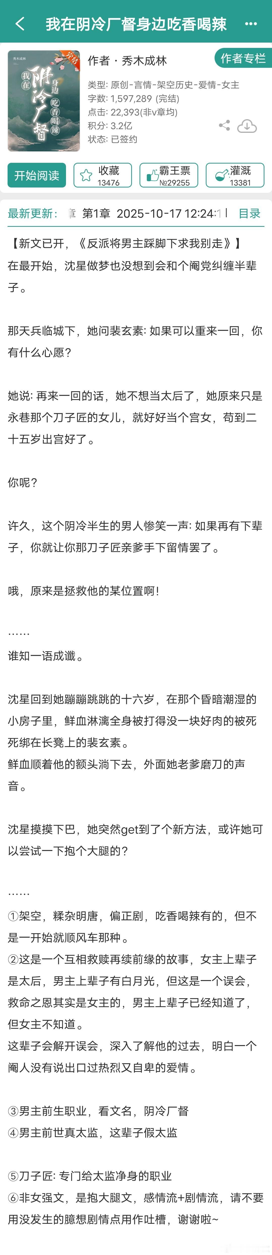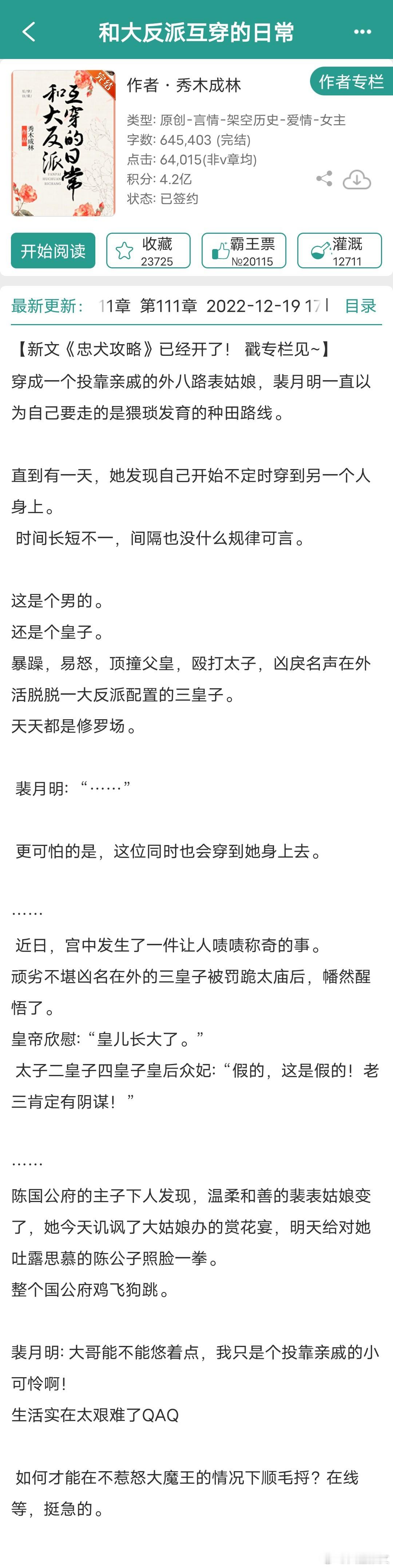 前几天看的那本,男女主有逃难剧情,让我想起一个很会写逃难,女主穿书/穿越,机智果敢,先婚后爱的作者——秀木成林。主页有18本完结言情,只有一本不是古言。1《反派将男主踩脚下求我别走》连载中,女主穿书2《我在阴冷厂督身边吃香喝辣》重生抱大腿文,互相救赎再续前缘女主上辈子是给太监净身的刀子匠女儿,进宫后从宫女一路苟到太后。男主上辈子是真太监,两人重生到男主被净身的那天。3《下大狱后我走上人生巅峰》女主穿书,原主夫家牵扯进夺嫡,全家被流放,新婚丈夫病死狱中,原主改嫁小叔子,最后在新帝暗示下“病死”。女主穿到蹲监狱待流放时期,从挽救快要狗带的夫君开始。4《错拿了女主剧本的咸鱼》冷漠专情真枭雄男主vs机智乐观生存高手女主5《和反派有难同当之后》女主穿书,女扮男装,男主打天下6《姜萱》男女主相互扶持,互相救赎,共同成长,前面逃难,相依为命是真好看,后面打天下7《皇子妃奋斗史》女主穿越,前期逃难,后期打天下网页链接8《和大反派互穿的日常》女主穿越,男女主灵魂互换网页链接9《忠犬攻略》10《道系女配拒走剧情》11《嫁给表哥之后》12《太子妃的荣华路》13《治愈任务失败后》14《皇后的锦绣之路》15《魔尊穿成我侍妾》16《高门庶女》17《穿书之女配不上岗》18《快穿之炮灰逢春记》19《八十年代翻身记》图11仅有的年代文,男女主军婚,致富之路推文言情小说推荐小说