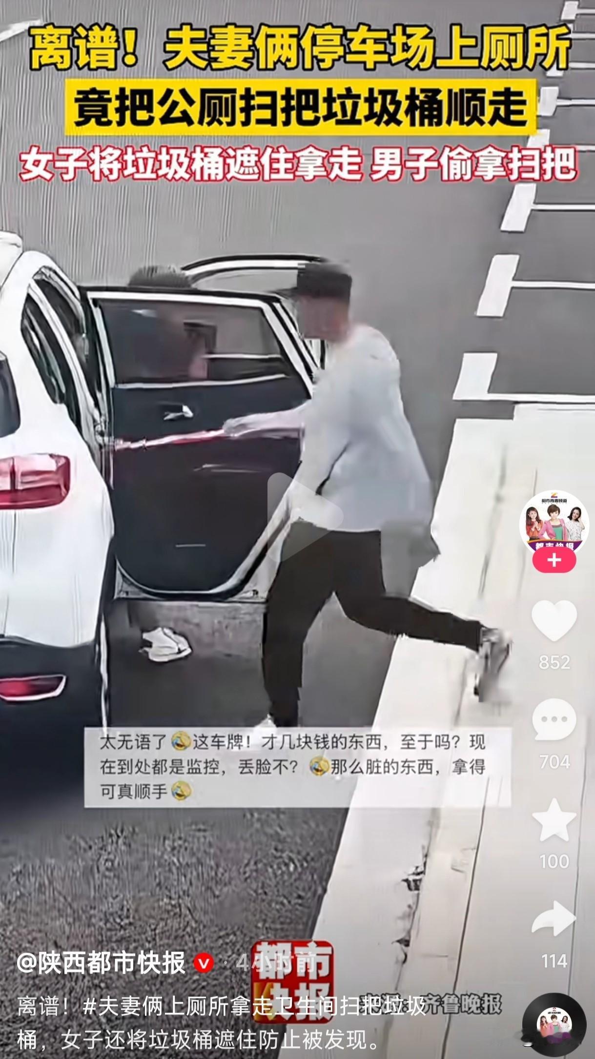 这年头真是偷什么的人都有…… 夫妻俩在停车场上厕所,妻子顺走了垃圾桶,丈夫拿着扫