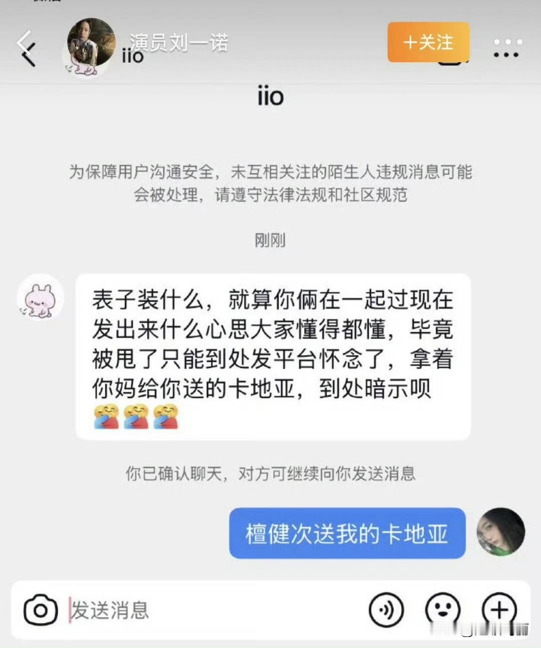 檀已经宣布单身了,吃🍉群众给个真经,粉丝不要下场女方那条,娱乐圈都是哄着来的,要么无视要么说点好话,这种不是很出名的演员+有点小钱脾气大得很,毕竟黑红总比没讨论度强,一急啥都发了。真心建议,想骂那我也没话说 檀健次 刘一诺