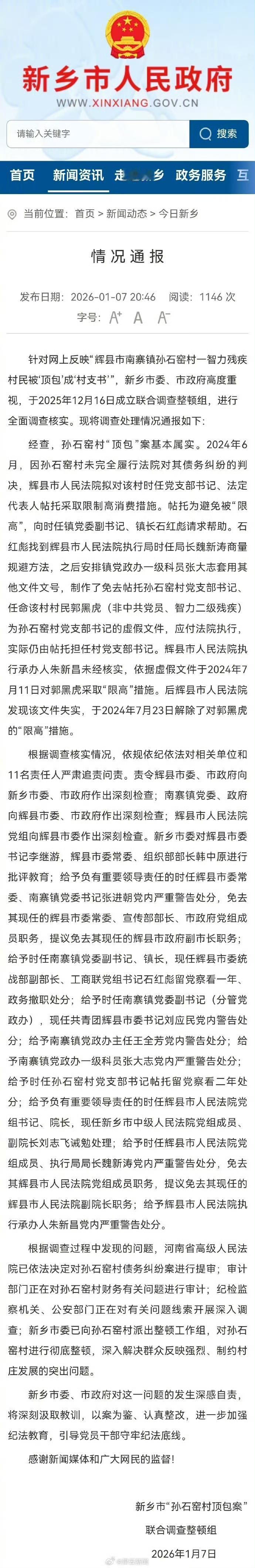 原以为是河南新乡辉县市南寨镇孙石窑村村支书自己搞的鬼,没想到竟然是镇党委政府帮忙搞的鬼!更让人没想到的是,事发过后镇里参与搞鬼的领导都升官了!帮助违法的村支书脱罪,而且让不是党员的智障人士担任村支书,镇党委书记等领导是怎么想的?而当时的镇党委书记还是副县级领导兼任的,连基本的党性原则都不讲了吗!这些人严重的受到了党内警告处分和免职处理,似乎有些太轻了,还应加重处分。