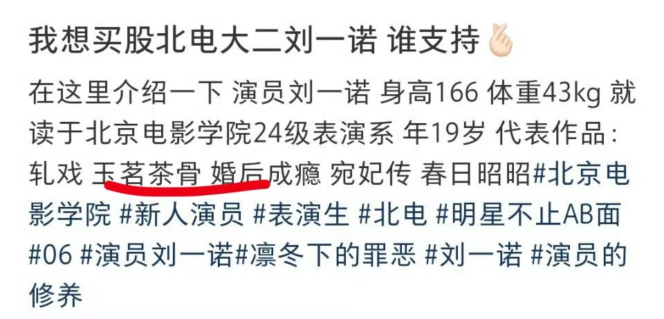 刘一诺演了玉茗茶骨我要笑死了,这个刘一诺说自己的代表作有玉茗茶骨和轧戏,看到18集,我真的不知道这个刘一诺演的是哪个角色檀健次 刘一诺檀健次刘一诺差16岁