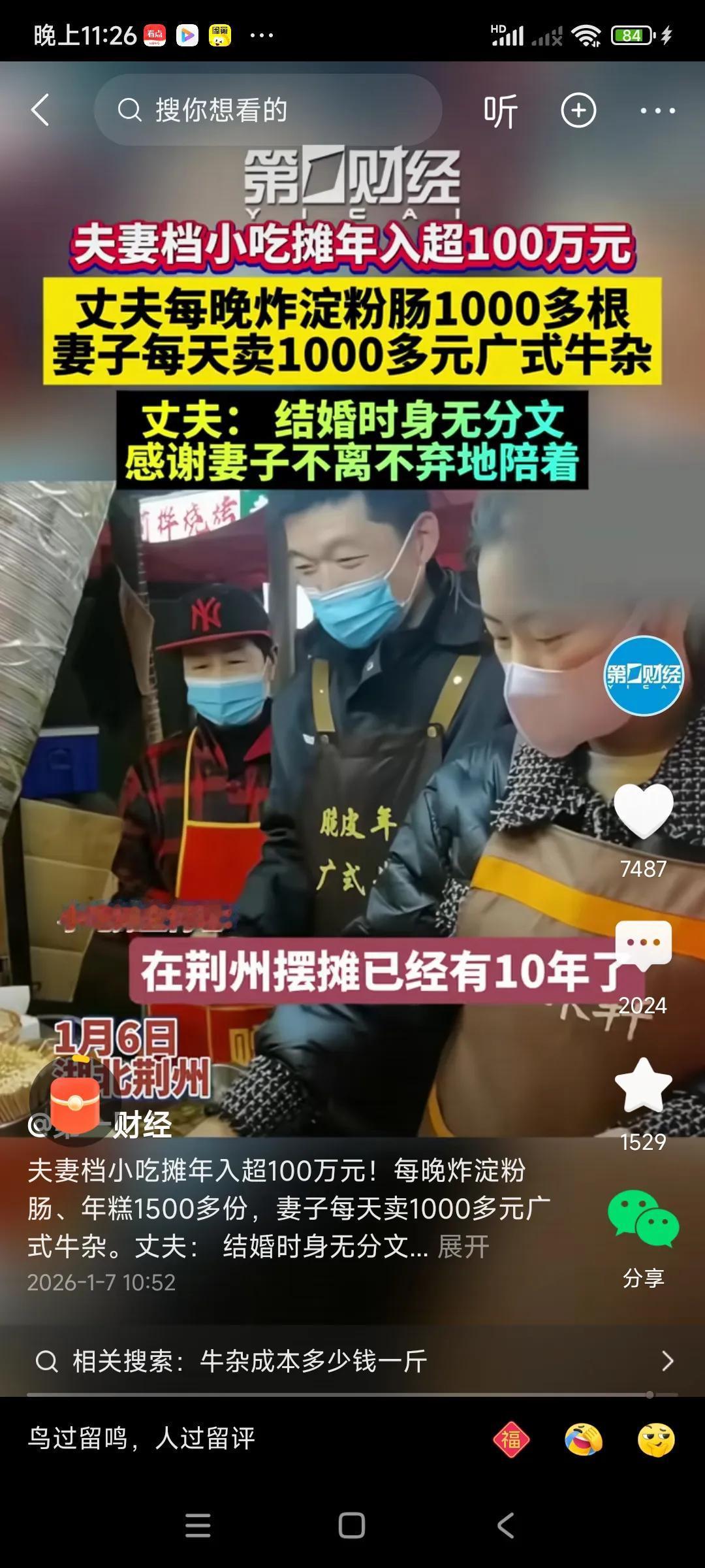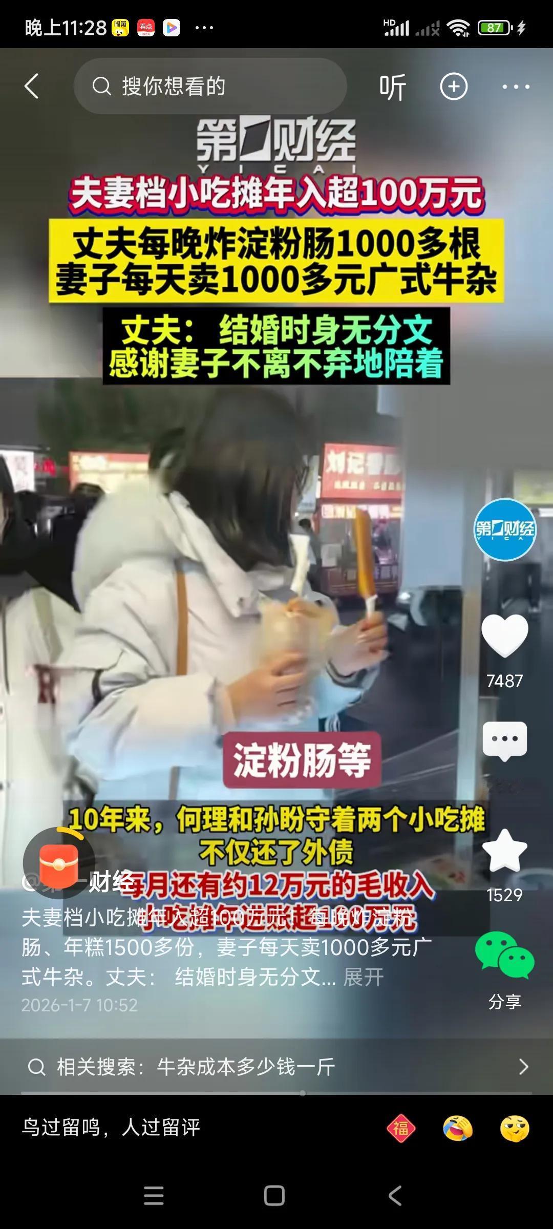 真没想到,路边卖烤肠生意这么好,一年能挣几十万,夫妇两人联手,一年可挣100万,相当厉害,, 只是比较辛苦,长时间站立,一天下来,也是挺累的,但挣钱不少啊,, 我前几天肚子饿了,在地铁口一个大姐那里买了两根烤肠,味道怪怪的,像是用面粉兑其他东西,油炸的,不是肉串,太难吃了,,[捂脸][捂脸] 后来扔掉了,,, 看来,给别人打工,发财是不可能的,, 做小生意,也比打工强很多,打工一般人几千元工资,吃个饭,交个房租,一个月没剩下多少,,[捂脸][捂脸] 做生意是多劳多得,自己做主,只是要多操心,要有经商头脑才行,太老实的人,干不了,,,