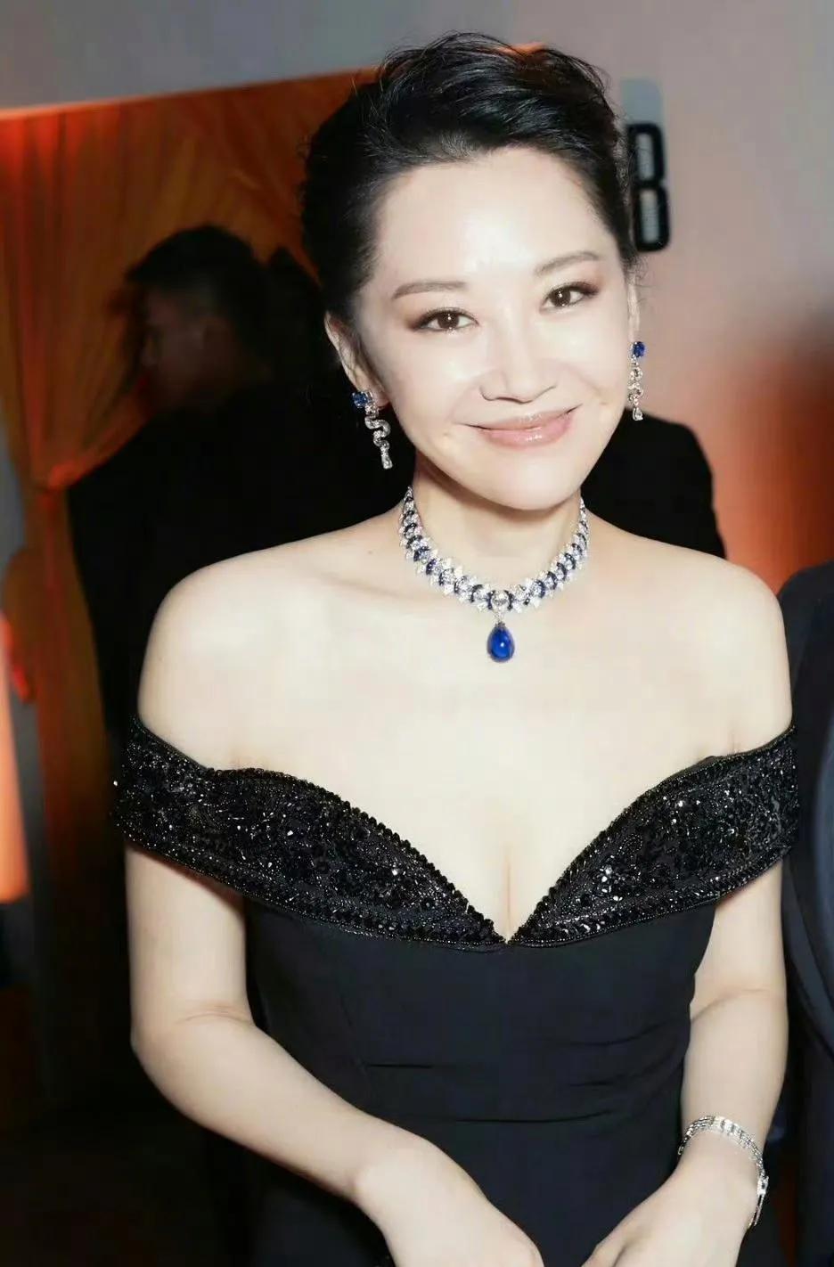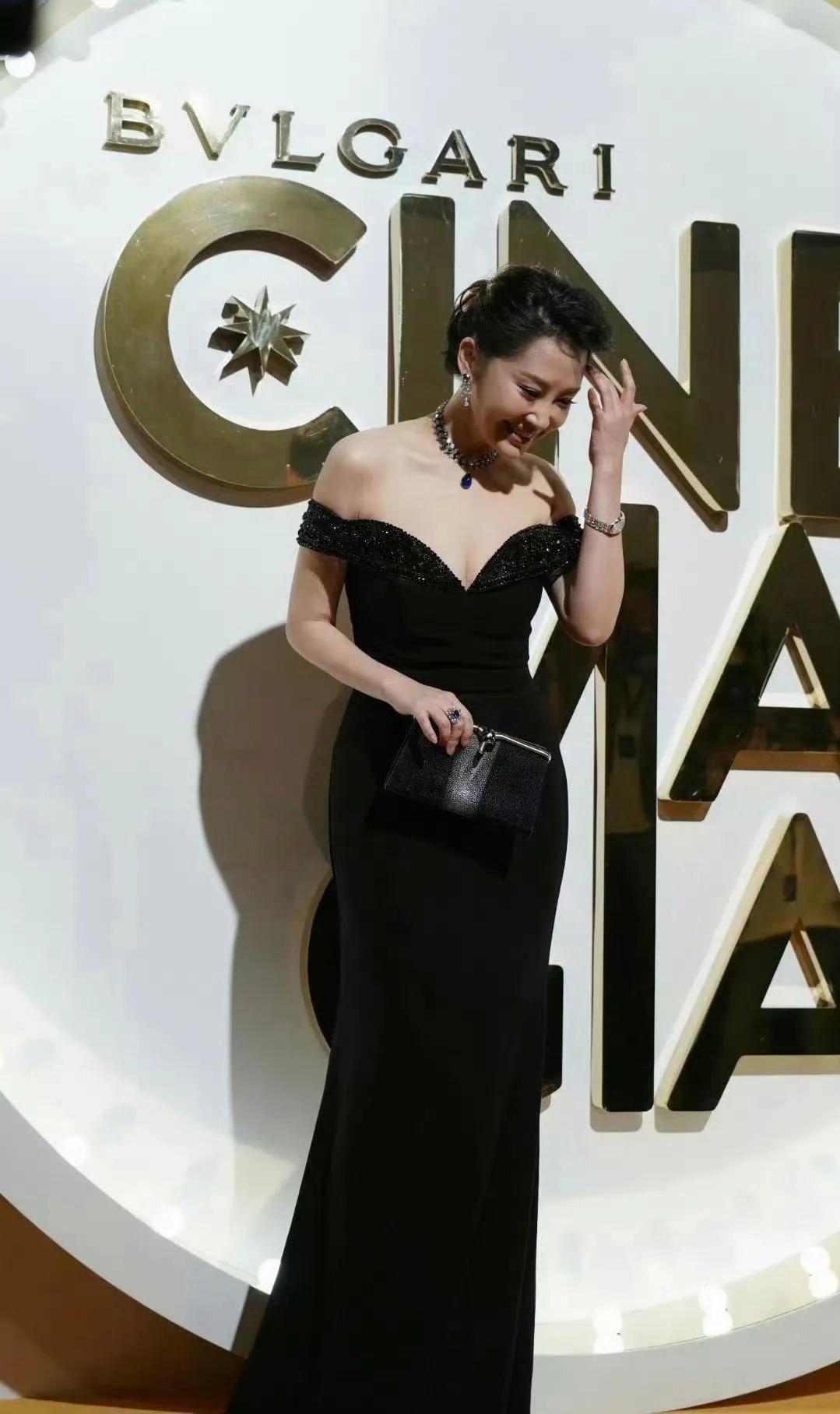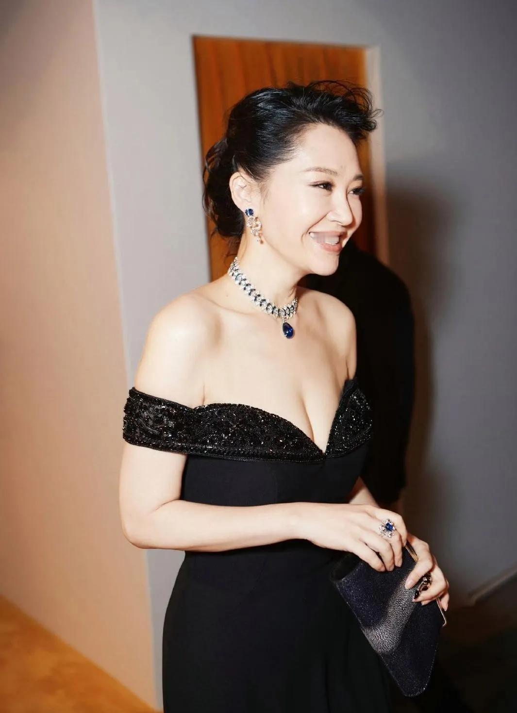 许晴的黑色礼服造型,美到让人移不开眼! 一袭黑色深V露肩长裙,勾勒出她完美的身材曲线,优雅又不失性感。 再配上蓝宝石项链和精致的耳饰,复古又高级,完全就是从画报里走出来的女神!