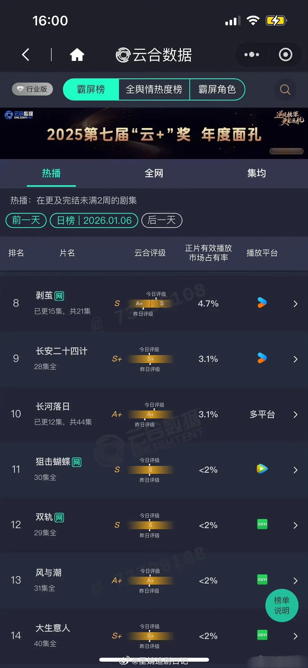 昨日在播剧云合占比 罚罪2 18.8% 骄阳似我 17.9% 逍遥 15.5% 玉茗茶骨 8.8% 轻年 6.2% 人之初 6.1% 剥茧 4.7%