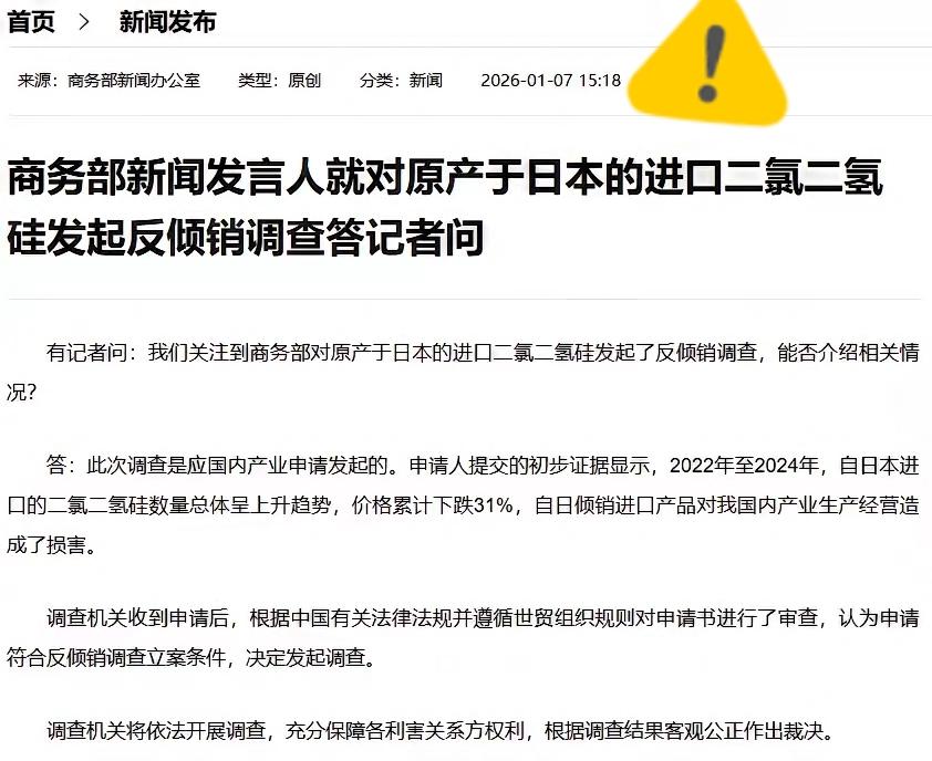 抡向小日子的第二棒来了! 继昨天宣布对日本出口的军民两用产品管制后,今天商务部又宣布对原产于日本的进口二氯二氢硅发起反倾销调查。 二氯二氢硅是一种在常温常压下为无色、易燃、有毒气体。 这东西看着陌生,却是高端芯片制造的“关键营养液”,手机、电脑里的核心芯片,生产时都得靠它沉积薄膜,纯度要求还得达到99.999%以上。 咱们是全球最大的半导体生产国,2024年对这材料的需求量就有4.2万吨,其中65%都用在半导体领域,可国产化率才刚到40%。 日本企业攥着技术优势,长期霸占高端市场,一边偷偷扩大对华出口量,一边疯狂压价,2022到2024年价格累计跌了31%,摆明了就是倾销。 这种不公平竞争让国内企业苦不堪言,唐山三孚等企业早就实现技术突破,却被低价进口货挤压得难有发展空间。 这两记重拳来得绝不偶然,前一天刚卡死日本军民两用产品的出口,第二天就直击其半导体产业命脉,精准度堪比手术刀。 日本外务省还敢跳出来抗议,说咱们“不符合国际惯例”,却忘了高市早苗公然叫嚣“台海有事就是日本存亡危机”的狂妄言论。 要知道这次调查完全依法依规,是国内产业提交充分证据后,商务部才正式立案,调查期将持续到2027年1月,特殊情况还能延长。 反倾销调查不是要断供,而是要扫清不公平竞争,让江苏雅克科技、中环股份等国产企业能公平竞争,推动行业加速进口替代。 按照业内预测,随着政策扶持和技术迭代,到2027年国产企业的市场占有率有望冲到55%,彻底打破日本的垄断格局。 中方的反制从来都精准克制,不波及普通民生,专打核心产业和军事相关领域,就是要让日本明白,挑衅红线必须付出代价。 日本商界已经慌了,信越化学、大阳日酸这些依赖中国市场的巨头,即将面临利润缩水、份额流失的困境。 政客的嘴炮终究要企业买单,高市早苗的冒险言论,正在让日本高端制造业吞下苦果,这就是挑衅中国核心利益的必然下场。 我们要的从不是对抗,而是公平的贸易环境和对国家主权的尊重,你敬我一尺,我还你一丈,反之亦然。 各位读者你们怎么看?欢迎在评论区讨论。
